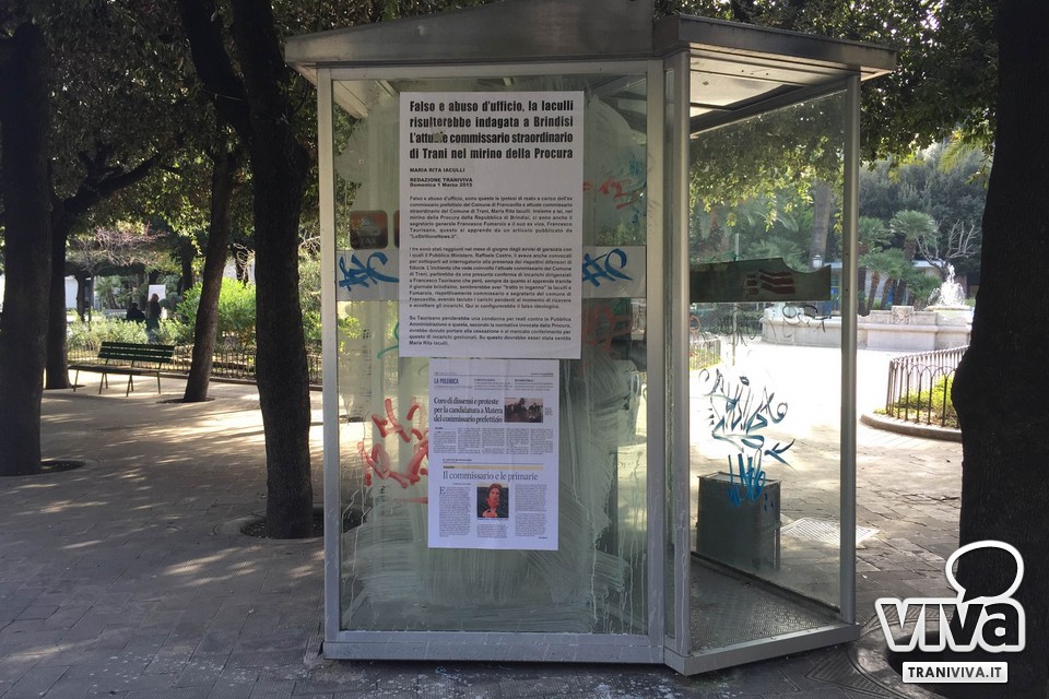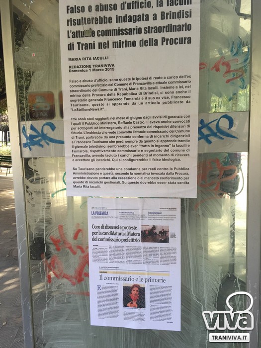 In relazione alla comparsa sui muri cittadini di manifesti abusivamente affissi aventi ad oggetto un articolo pubblicato su questo sito in data 1° marzo, dal titolo "Falso e Abuso d'ufficio, la Iaculli risulterebbe indagata a Brindisi"; TraniViva si dichiara totalmente estranea all'accaduto e sottolinea la gravità dell'episodio.