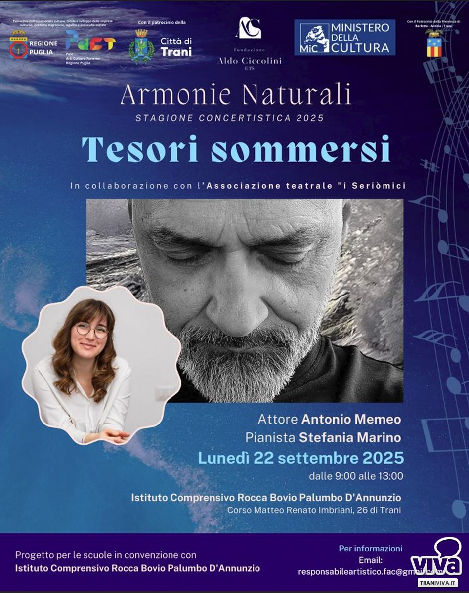 L'obiettivo principale di "Tesori Sommersi" è quello di creare interesse per la musica tra i giovani studenti, offrendo loro un'occasione di arricchimento culturale attraverso un programma coinvolgente e un'esperienza educativa indimenticabile. Non perdete questa occasione di immergervi in un mondo di meraviglie e di scoprire come la musica possa svelare i tesori nascosti nelle storie che tutti amiamo. L'evento si avvale del sostegno del Fus (Fondo unico per lo spettacolo) del Ministero della Cultura e dei seguenti patrocini: Città di Trani, Assessorato Cultura, Tutela e Sviluppo delle Imprese Culturali, Politiche Migratorie, Legalità e Antimafia Sociale della Regione Puglia, del PACT – Polo Arti Cultura Turismo e della Provincia di Barletta-Andria-Trani.
