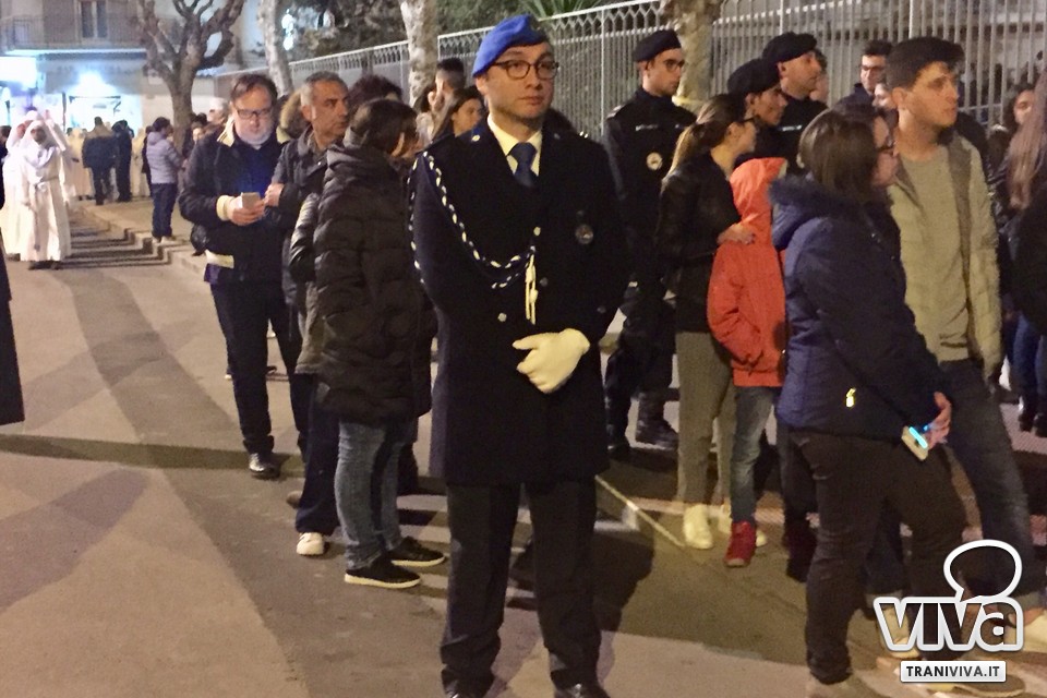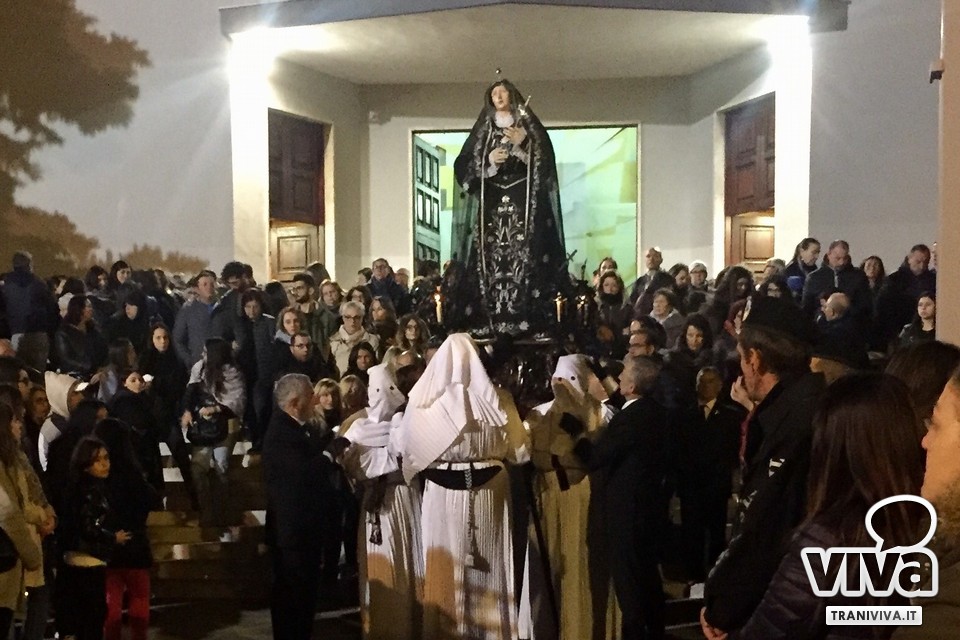 È servita a poco l'ordinanza del sindaco Amedeo Bottaro che disponeva lo spegnimento della pubblica illuminazione nella zona intorno alla chiesa di Santa Teresa, in concomitanza con l'uscita della statua della Vergine Addolorata. I flash dei cellulari e delle fotocamere hanno illuminato a giorno la strada. Come al solito, in centinaia e centinaia hanno voluto assistere alla sua trionfale uscita dalla chiesa verso la sua lunga ricerca del figlio Gesù. Tutto, però, si è svolto nel massimo ordine e nel rispetto della tradizione. Il silenzio e la preghiera hanno accompagnato l'Addolorata durante tutto il suo percorso per le strade della città. Tra i momenti di maggior commozione l'entrata della statua nel carcere femminile di piazza Plebiscito, segno che la Vergine è vicina ai dolori di tutti.