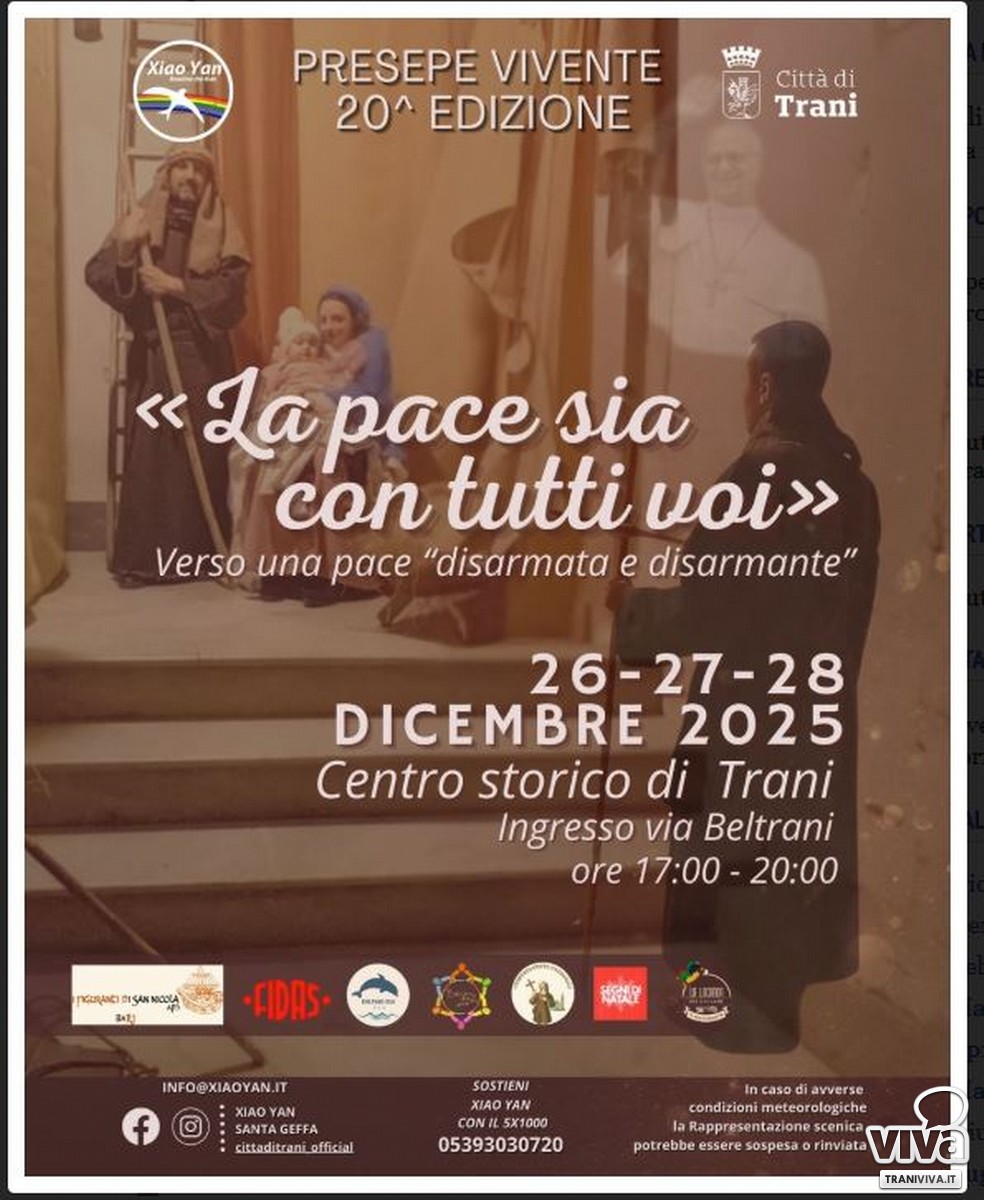 A Trani, il periodo natalizio raggiunge il suo culmine spirituale e tradizionale con il ritorno del Presepe Vivente, che quest'anno celebra la sua XX edizione. L'evento, promosso dalla Cooperativa Xiao Yan con il patrocinio del Comune di Trani, si svolgerà nel cuore suggestivo del centro storico da venerdì 26 a domenica 28 dicembre 2025, con orario continuato dalle 17:00 alle 20:30.