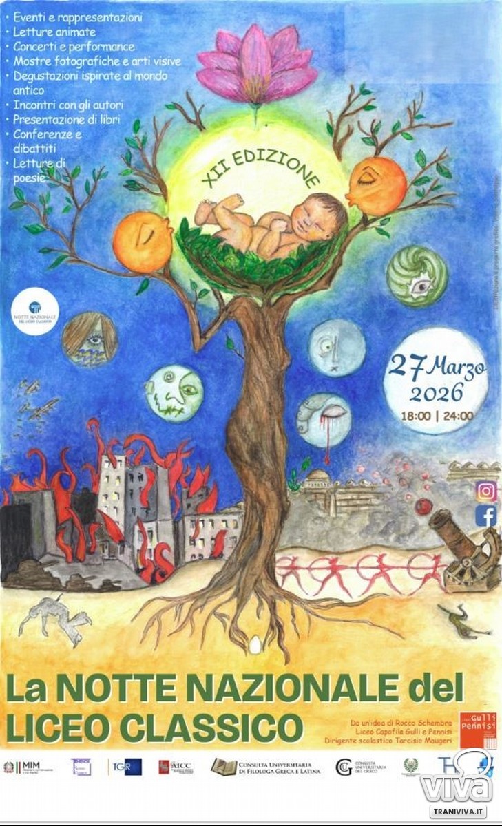 Anche quest'anno il Liceo Classico De Sanctis di Trani partecipa alla XII edizione della Notte Nazionale del Liceo Classico. L'evento, nato da un'idea del prof. Rocco Schembra, ricercatore di Filologia Classica dell'Università di Torino, e sostenuto dal Ministero dell'Istruzione e del Merito, quest'anno si celebrerà venerdì 27 marzo 2026, a partire dalle ore 18:00, in quasi 350 licei classici e 30 licei stranieri.