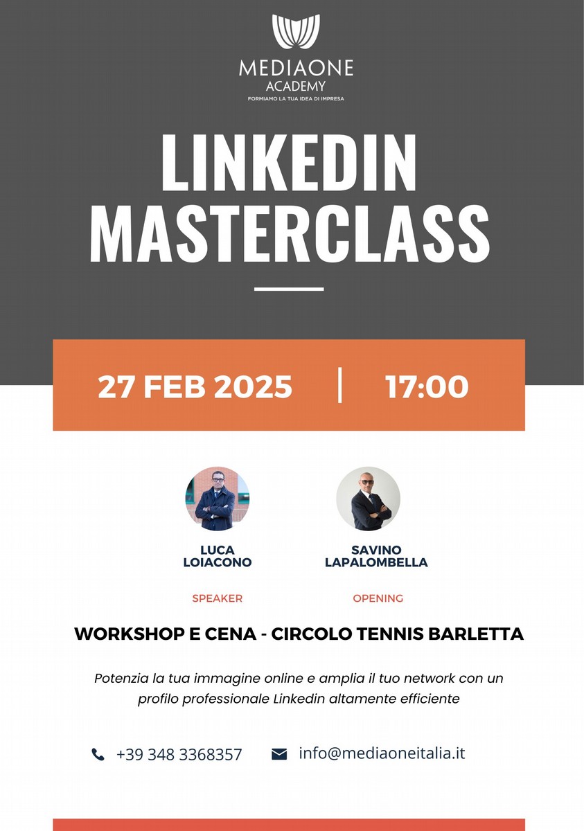 Giovedì 27 febbraio, a partire dalle ore 17:00, il Circolo Tennis Barletta ospiterà un evento imperdibile per tutti i professionisti desiderosi di accrescere la propria visibilità e costruire nuove opportunità di business: la Masterclass su LinkedIn organizzata da Mediaone Academy, business unit di Mediaone Italia specializzata nella formazione manageriale.
