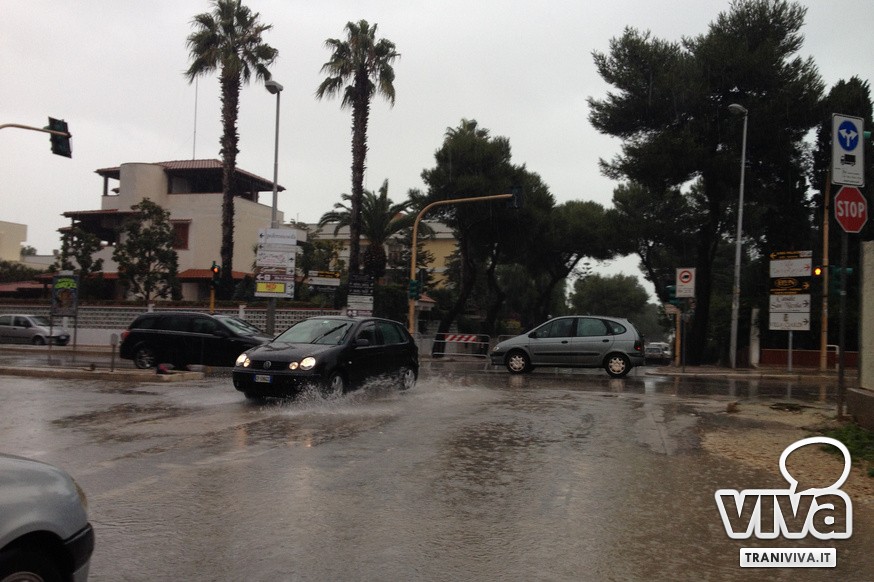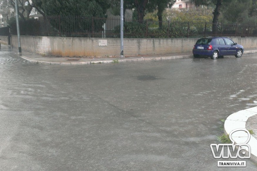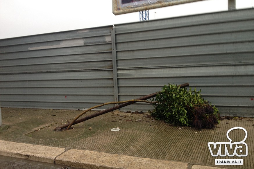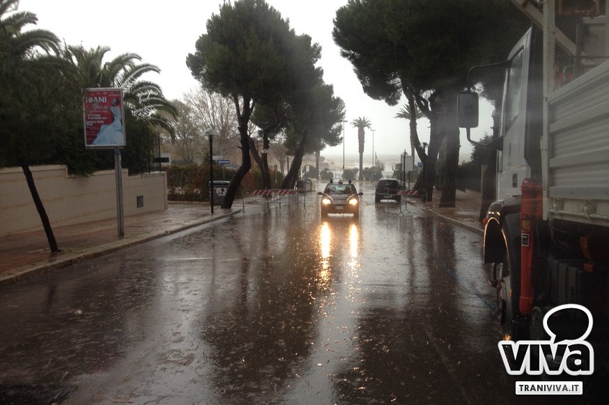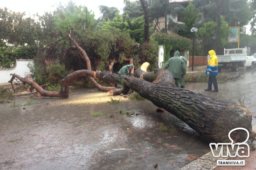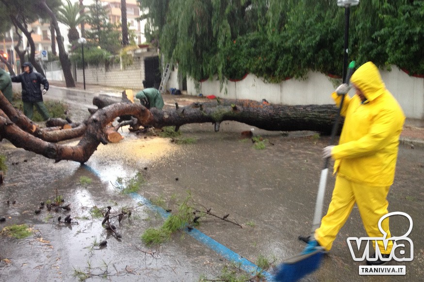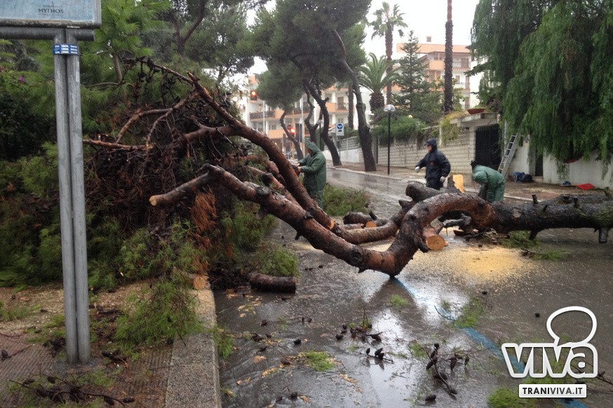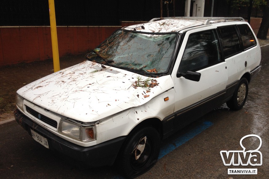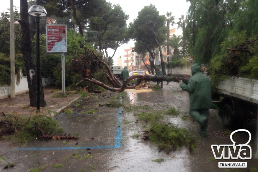 Alberi divelti e vie allagate: sono i segni lasciati lungo le strade di Trani dalla violenta perturbazione in transito sulla nostra regione. La situazione, soprattutto a fine mattinata, si è rivelata critica in tutte le zone della città, come testimoniano alcuni scatti fotografici pubblicati sul gruppo Facebook Tranispia.L'episodio più grave riguarda la caduta di un pino in viale De Gemmis, nei pressi del piazzale di Colonna: qui un albero di grandi dimensioni è stato abbattuto dal vento, distruggendo una vecchia Skoda parcheggiata lungo la strada. La circolazione è stata interdetta dal semaforo (incrocio con via Bisceglie) sino a piazza Marinai d'Italia: sul posto per la rimozione dell'albero è intervenuta una squadra della cooperativa Re Manfredi. La strada è stata presidiata da una pattuglia della Polizia Locale di Trani.