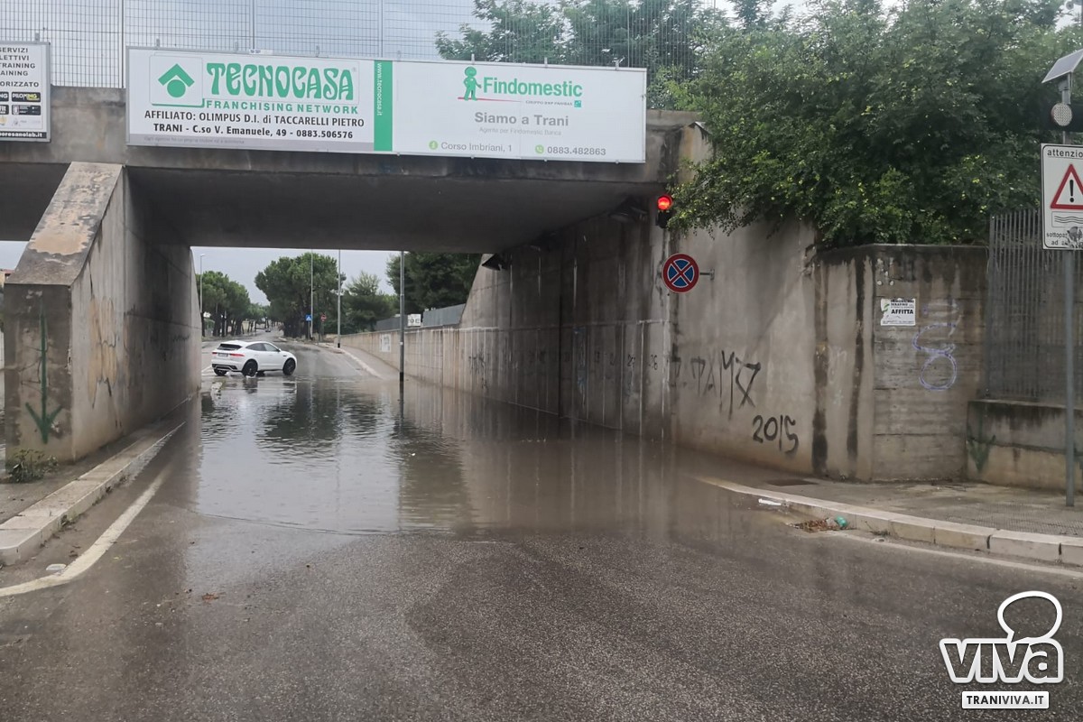 Il sottopasso di Pozzo Piano è parzialmente allagato: attivato, comunque, il semaforo rosso per non consentire il transito delle auto. Il maltempo proseguirà anche per le prossime ore: la sezione regionale di Protezione Civile ha emesso, alle 14:00 di sabato 13 luglio, una nuova allerta meteo arancione per la Puglia centrale adriatica - zona che comprende anche il territorio di Trani - relativa a un rischio idrogeologico dovuto a forti temporali per le successive 18 ore, fino alle 8:00 del mattino di domenica 14 luglio.
