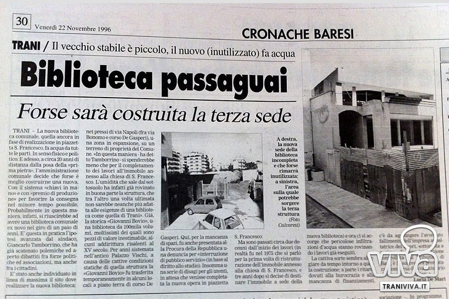 Non è la prima volta che l'acqua fa visita in maniera indesiderata alla biblioteca. Il problema arriva dalla strada e più precisamente dalla piazzetta. L'acqua che scende da via Mario Pagano non trova opposizione, allagando il pian terreno della Giovanni Bovio. Le quattro piccole caditoie poste all'ingresso nulla possono specialmente in caso di precipitazioni come quelle di ieri sera. Nulla di nuovo, nulla che già non si sappia come testimonia un articolo del novembre del 1996 de La Gazzetta. Nell'articolo, scritto quando erano ancora in corso i lavori di completamento del plesso, l'allora sindaco Giancarlo Tamborrino, prefigurava buona parte dei problemi attuali.