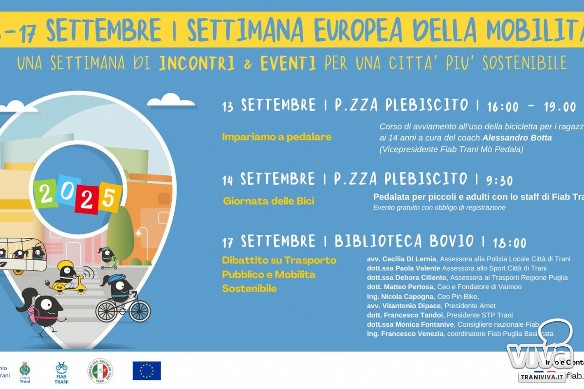 Il programma, patrocinato dal Comune di Trani e organizzato da FIAB Trani, prevede incontri ed eventi dedicati a grandi e piccoli, con l'obiettivo di promuovere l'uso della bicicletta, la mobilità attiva e il trasporto pubblico come strumenti fondamentali per migliorare la qualità della vita nelle città.