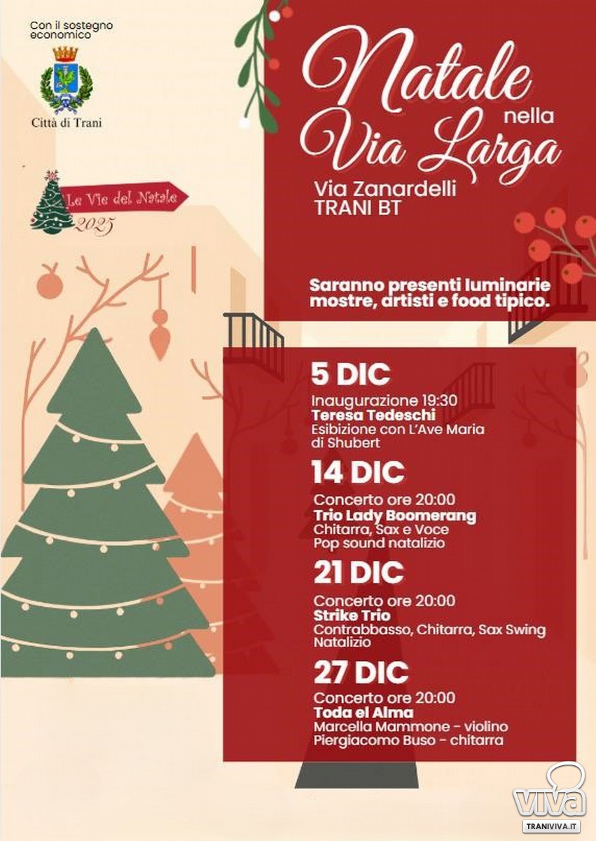La storica "Via Larga" torna a essere il cuore pulsante del Natale tranese. Via Zanardelli si veste a festa grazie alla sinergia tra i commercianti della zona e il Comune di Trani, trasformando l'arteria simbolo del borgo ottocentesco in un salotto a cielo aperto. Tra luminarie, mostre e sapori della tradizione, prende il via stasera una rassegna di quattro appuntamenti che unirà musica, gusto e arte per tutto il mese di dicembre.