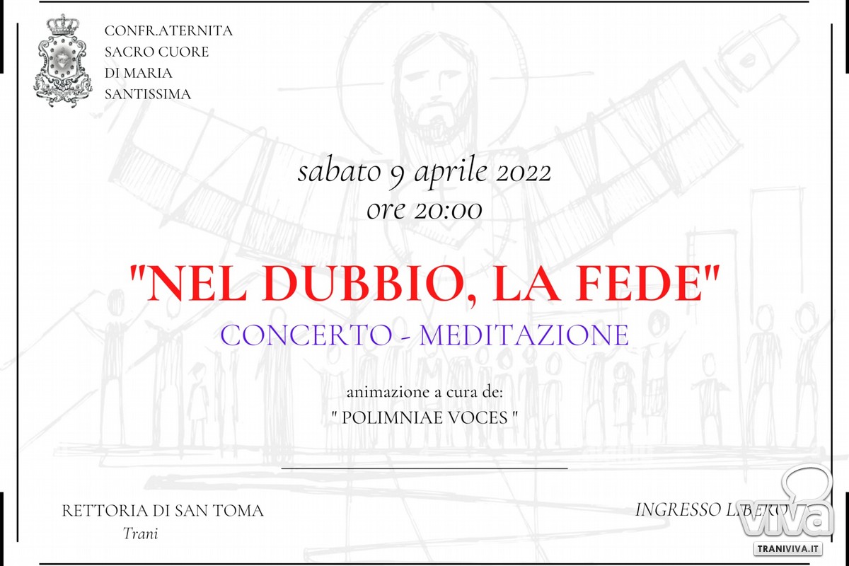 Anche un concerto meditativo, per indurre alla riflessione e alla preghiera accompagnati dalla musica e dal canto corale, tra i riti previsti per l'apertura della settimana Santa dalla confraternita Sacro Cuore di Maria santissima della rettoria di San Toma. Sabato 9 aprile dopo il santo rosario alle 18:30 e la santa Messa, unita alla lettura della passione di Cristo, avrà luogo nella chiesa di San Toma un concerto - meditazione.