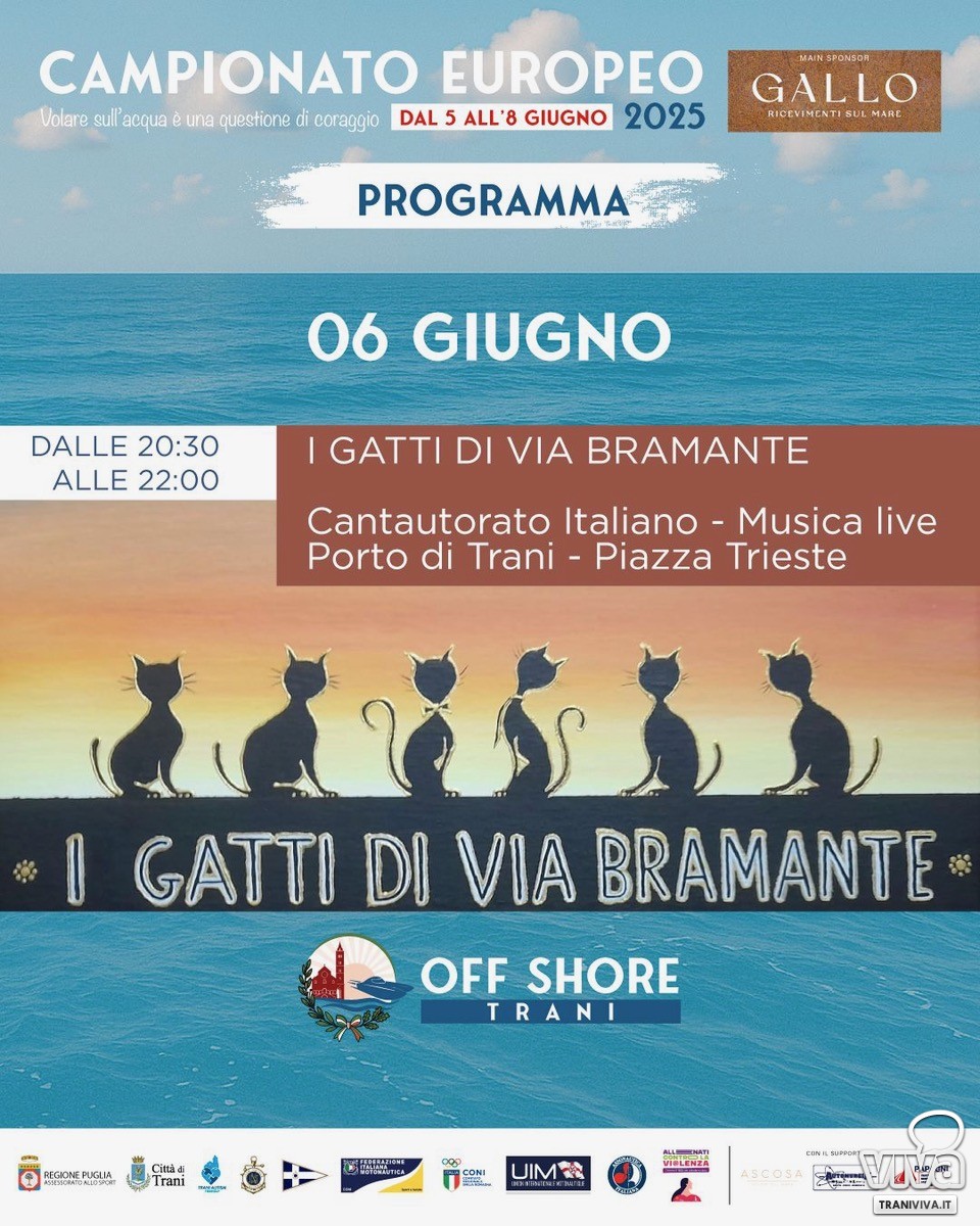 Nell'adrenalina della gara tra i bolidi del mare che corrono per il Titolo del Gran Prix Regione Puglia - Trofeo Città di Trani, per il prestigioso Campionato Europeo di Off Shore non mancherà lo spazio per l'intrattenimento non soltanto in acqua, con le esibizioni mozzafiato di flyboard e di freestyle Jetsky e le incredibili acrobazie di Roberto Magnani.Dalle otto di sera, piazza Trieste sarà il palcoscenico di tre bellissime serate dedicate alla musica e al teatro.