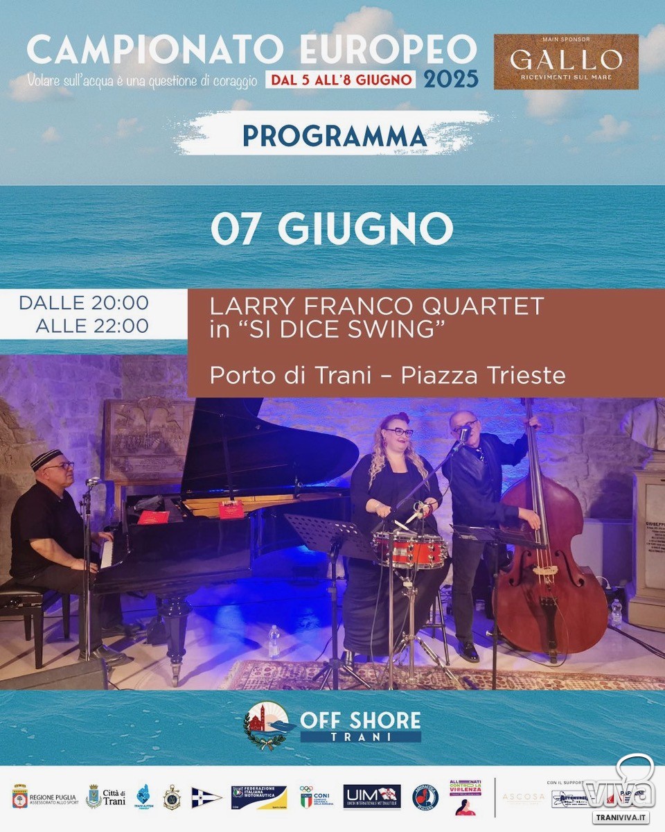 - Sabato 7 giugno spazio allo swing del grande musicista Larry Franco con il suo quartet di fiducia in piazza Trieste dalle ore 20. il carismatico pianista pugliese, con oltre trent'anni di carriera alle spalle e con tour nei migliori jazz club italiani ed europei, animerà il pubblico con un viaggio elegante e coinvolgente nella musica swing insieme alla sua band e l'inseparabile Dee Dee Joy che riscalderà con la sua voce ipnotica e sognante il ritmo delle canzoni.