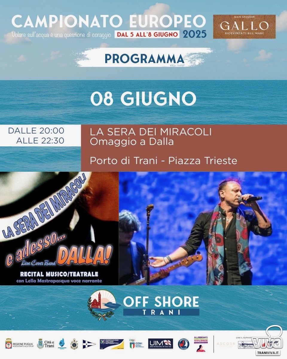 - Domenica 8 giugno si chiude con un sentito "Omaggio musicale e teatrale a Lucio Dalla", per rievocare i suoi più grandi successi senza snaturarli, con nuovi sound da scoprire durante il live che si terrà sempre in piazza Trieste dalle ore 20 con "La sera dei miracoli", band che nasce dalla passione comune dei sei musicisti (Cantante Enzo Matichecchia, Batteria Carlo Pisani, Chitarra Leo de Candia, Basso Elio Drago, Tastiere Leo Sciancalepore, Corista Noemi Mazzola) per il cantautore bolognese. con lo stesso spirito di celebrazione dell'artista, Lella Mastrapasqua racconterà curiosità ed aneddoti sulla vita sia personale che artistica di Dalla in un Reading teatrale che intervallerà le canzoni interpretate dal frontman Enzo Matichecchia.