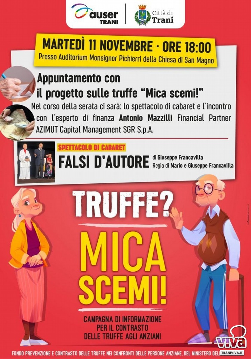 L'impegno per la sicurezza e la consapevolezza della cittadinanza si rafforza con il progetto "Occhio alle truffe - Mica Scemi!". Oggi, martedì 11 novembre, alle ore 18:00, l'Auditorium Monsignor Pichierri della Chiesa di San Magno sarà la sede di un appuntamento dedicato alla prevenzione e al contrasto delle truffe ai danni delle persone anziane, promosso dalla Città di Trani ed attuato dall' Auser Trani. Questa iniziativa, che rientra nel Fondo nazionale del Ministero dell'Interno, è di fondamentale importanza poiché affronta un fenomeno in crescita che colpisce con particolare violenza le fasce più vulnerabili. Il progetto si distingue per il suo approccio multidimensionale, unendo la serietà dell'informazione alla leggerezza dell'intrattenimento.