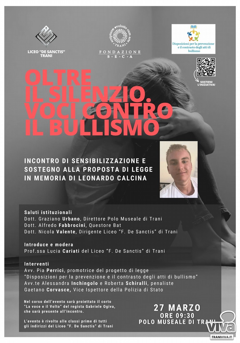 Sarà il Liceo "F. De Sanctis" di Trani a farsi promotore di un messaggio forte e necessario: il contrasto al bullismo parte dalla scuola. Venerdì 27 marzo 2026, alle ore 9.30, le classi prime di tutti gli indirizzi si ritroveranno presso il Polo Museale di Trani per l'evento "Oltre il silenzio: voci contro il bullismo", un momento di confronto, riflessione e consapevolezza rivolto alle nuove generazioni.