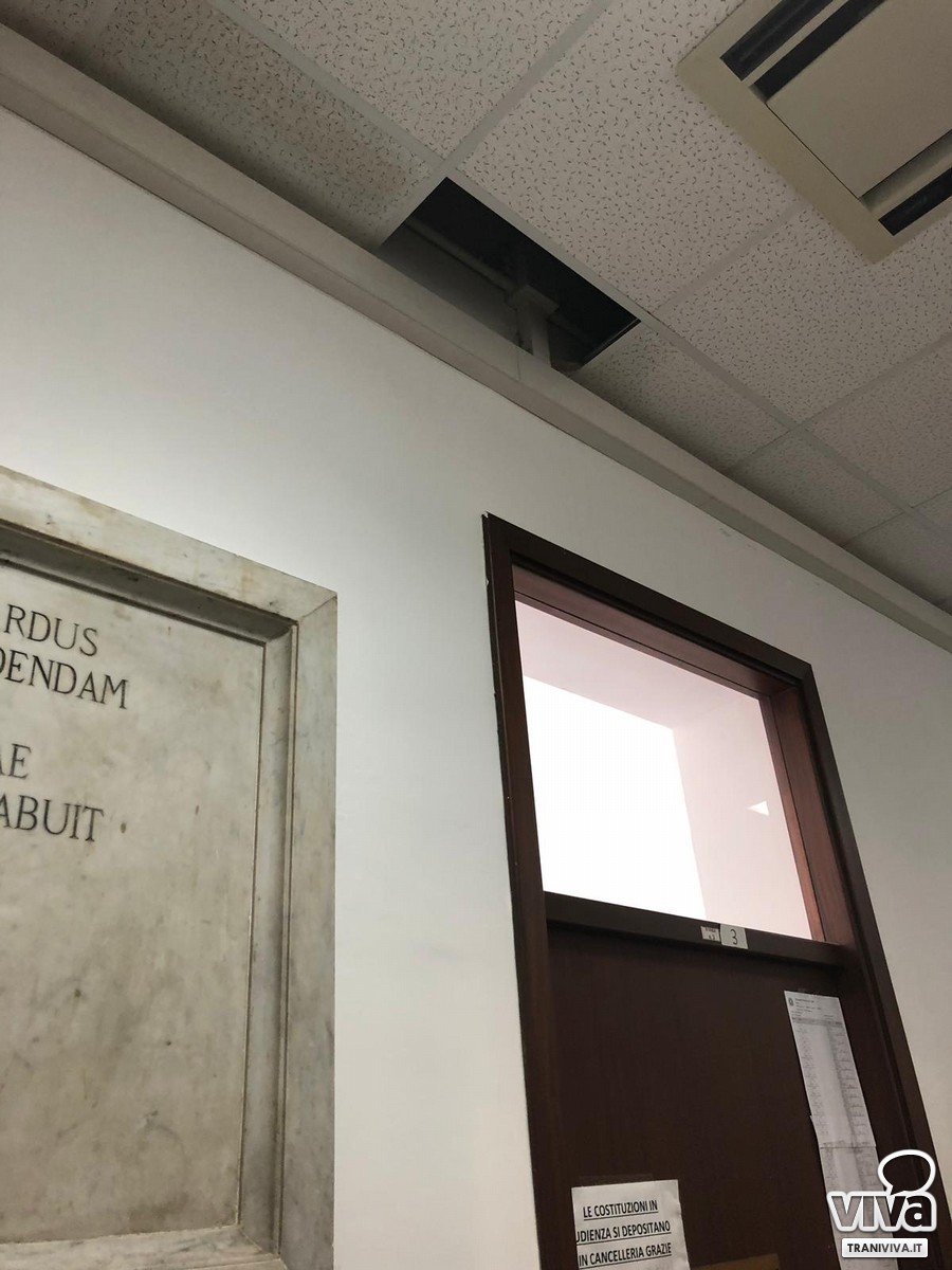 Anche perché sempre la fortuna ha voluto che in corrispondenza della zona di cedimento ci fosse un carrello coi fascicoli d'udienza. La causa del cedimento sarebbe attribuibile ad infiltrazioni dell'impianto di climatizzazione (che corre proprio al di sopra della controsoffittatura) per cui nei giorni scorsi si era già richiesto l'intervento di manutentori a causa di una perdita d'acqua nell'ufficio del dr. Vincenzo Sciascia: non sarebbe un caso che il cedimento sia avvenuto all'altezza del corridoio in cui si affaccia la sua stanza.