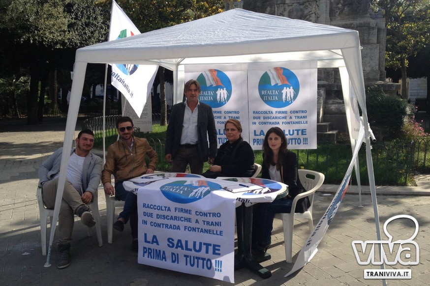 È iniziata questa mattina alle 9 e continuerà fino alle 13 la raccolta firme promossa dal direttivo di Realtà Italia che si batte contro il conferimento di nuovi rifiuti a Trani in contrada Fontanelle. Secondo quando scrivono il commissario provinciale, Nicholas Modugno, e il commissario cittadino, Eleonora Vitale «questa battaglia è a tutela della salute dei tranesi e ancor di più a tutela del nostro territorio».