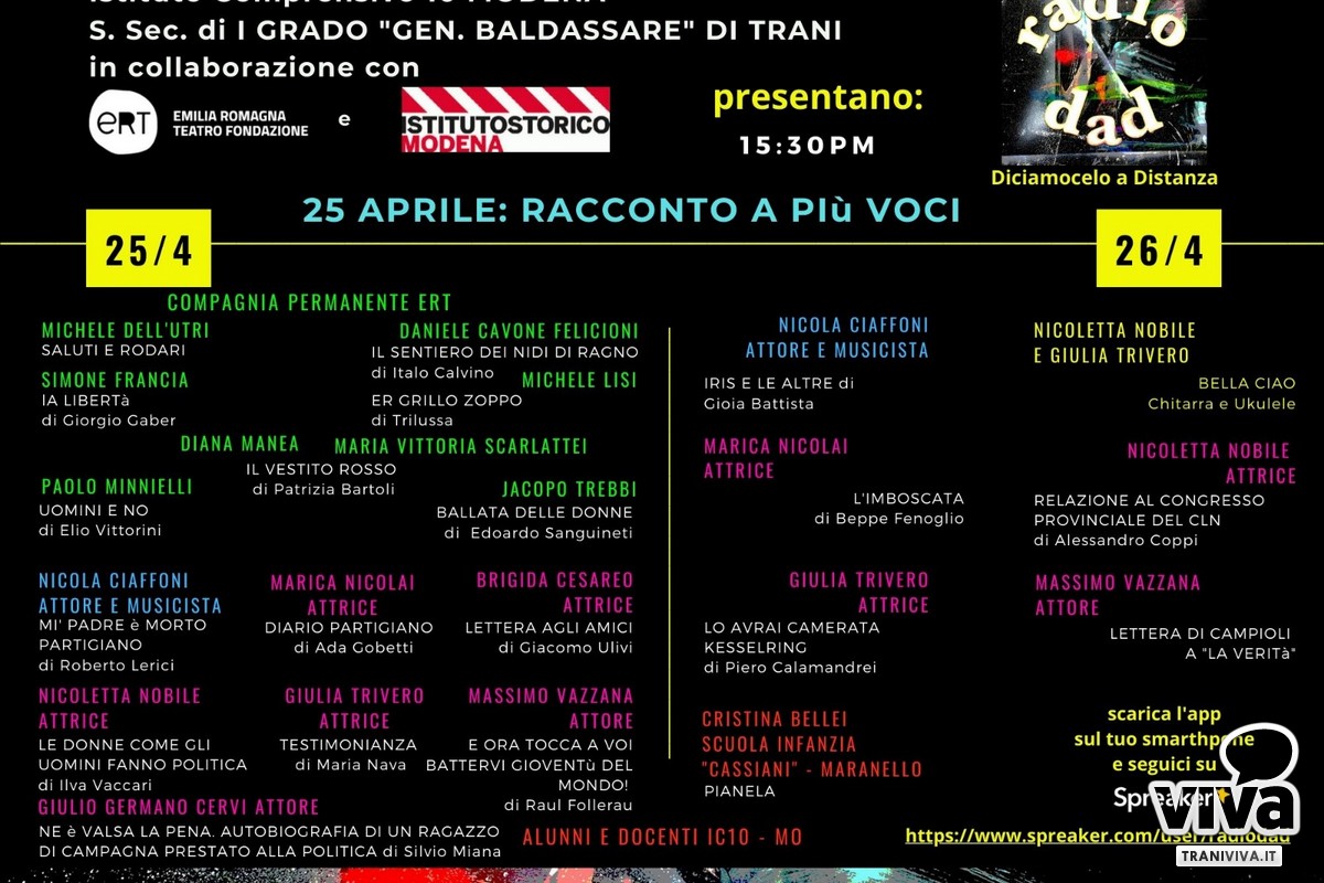 La prima trasmissione di Radio DaD - Diciamocelo a Distanza programmera' contributi di cantanti, attrici e attori che interpretano la nostra Festa Nazionale a 75 anni dal 25 aprile del 1945, giorno della Liberazione dalla dittatura e dall'occupazione nazi-fascista. Da Trani sono previsti gli interventi di: Marco Galiano (Dirigente Scolastico, S.S. 1 G. Baldassarre di Trani), Cherubina Palmieri (assessore alla Gentilezza, al Patrimonio, alla Trasparenza e all'Innovazione del comune di Trani), Felice Di Lernia (assessore alla Pubblica Istruzione e alle Culture del comune di Trani), Roberto Tarantino (dirigente scolastico in pensione, presidente di ANPI BAT), Pierluigi Colangelo (Legambiente Trani), Siro Sterpellone (ANPI Trani). L'Istituto Comprensivo 10 di Modena ha programmato letture ed interventi in collaborazione con l'Istituto Storico di Modena ed Emilia Romagna Teatro Fondazione, con gli interventi di attori amici della scuola e la Compagnia Stabile ERT.