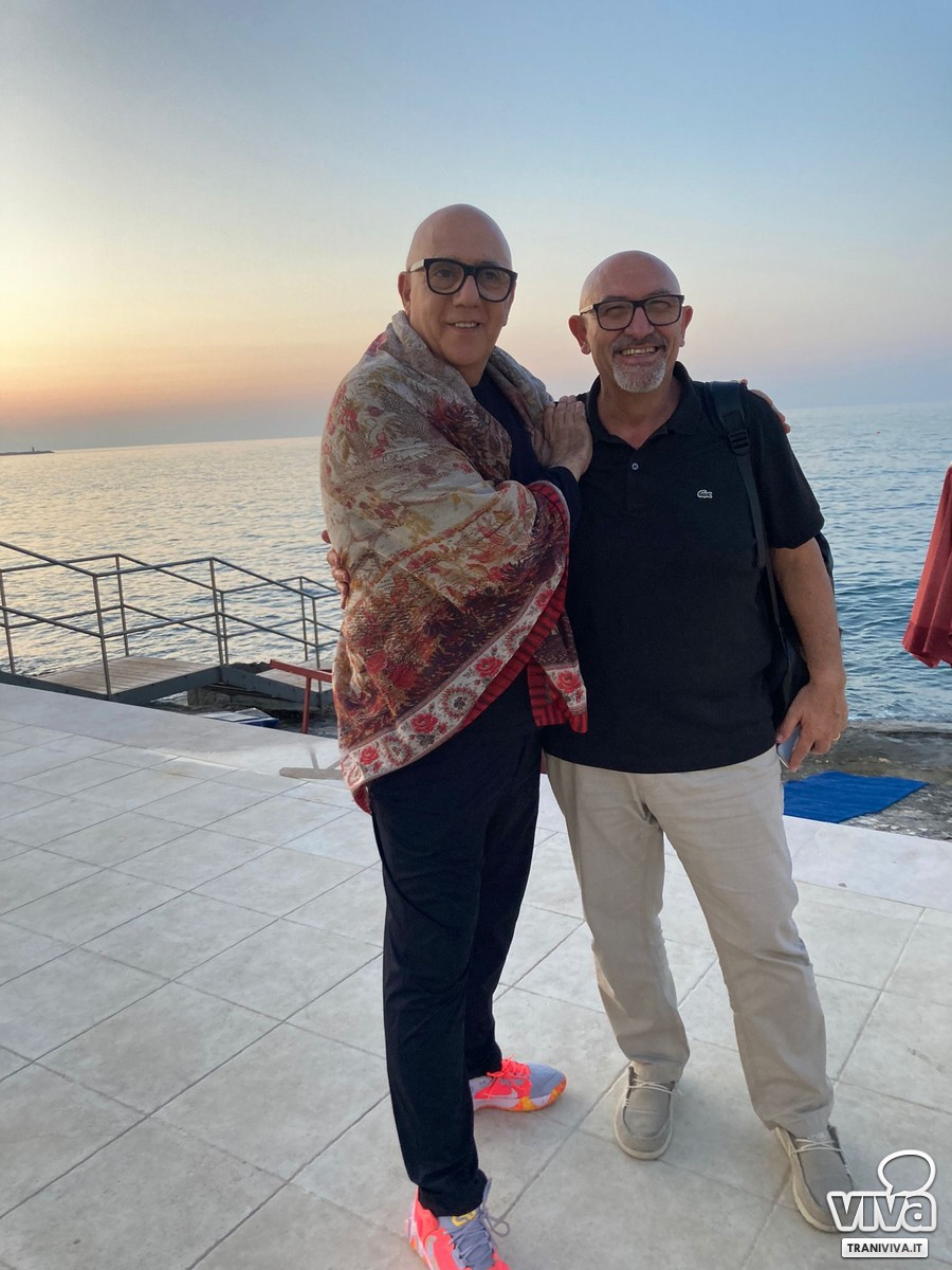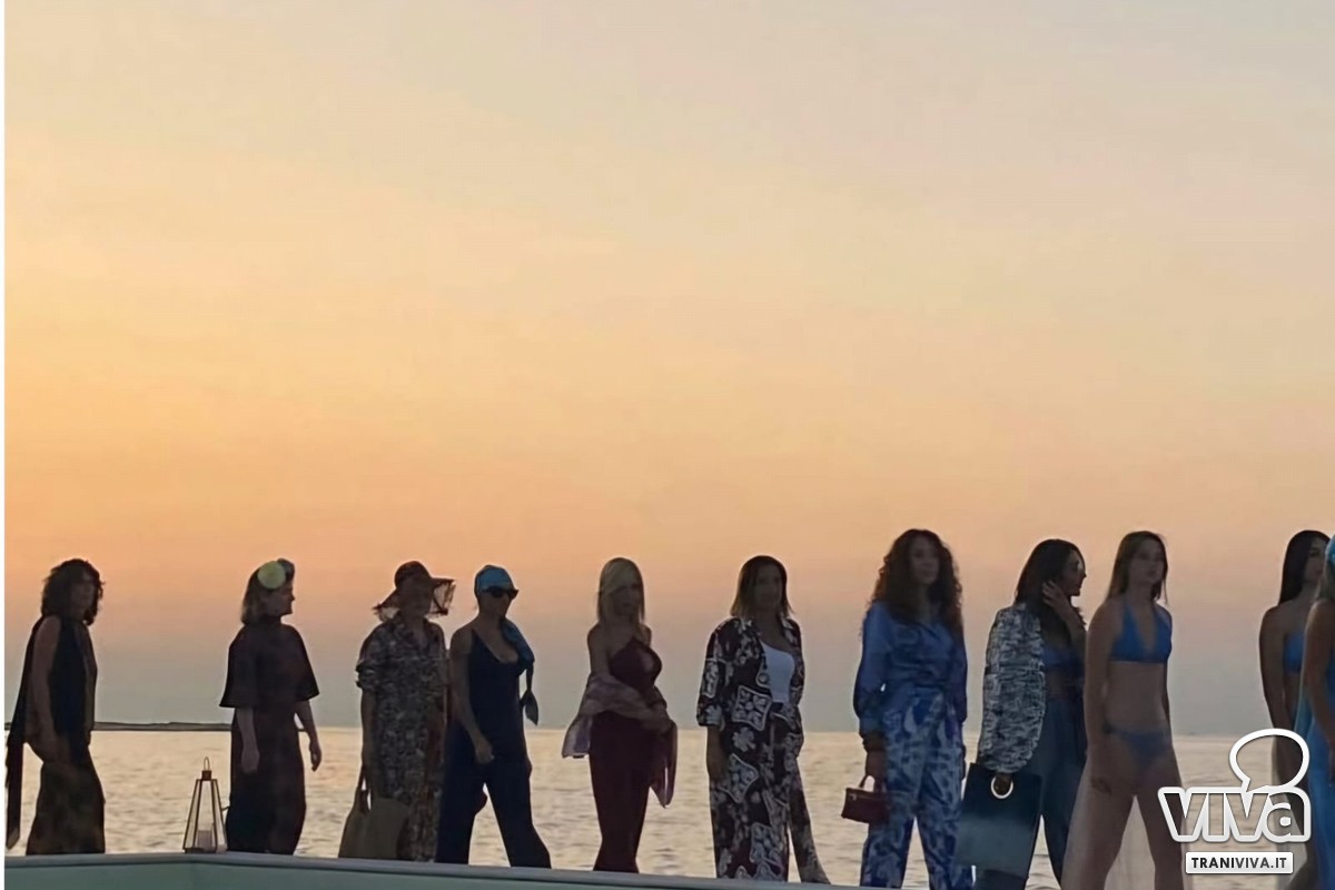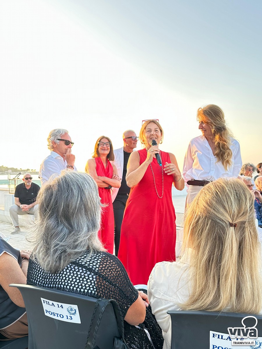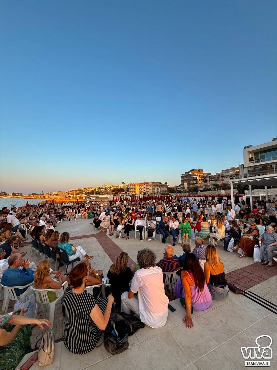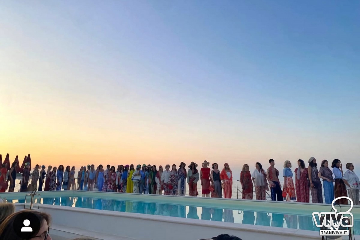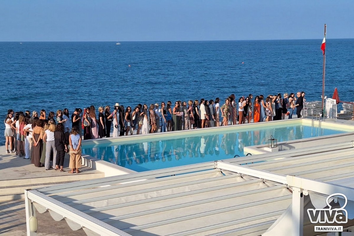 La costa rocciosa di Trani, incorniciata dai colori tenui del tramonto, tra il profilo del promontorio del Gargano e la maestosità del monastero sulla penisola di Colonna, si è trasformata nella scenografia di una passerella snodata tra la scalinata del lido in un percorso disegnato dai posti a sedere e dalla piscina, ammaliando gli oltre cinquecento ospiti presenti (oltre la folla affacciata dal lungomare) in un crescendo di emozione e partecipazione.