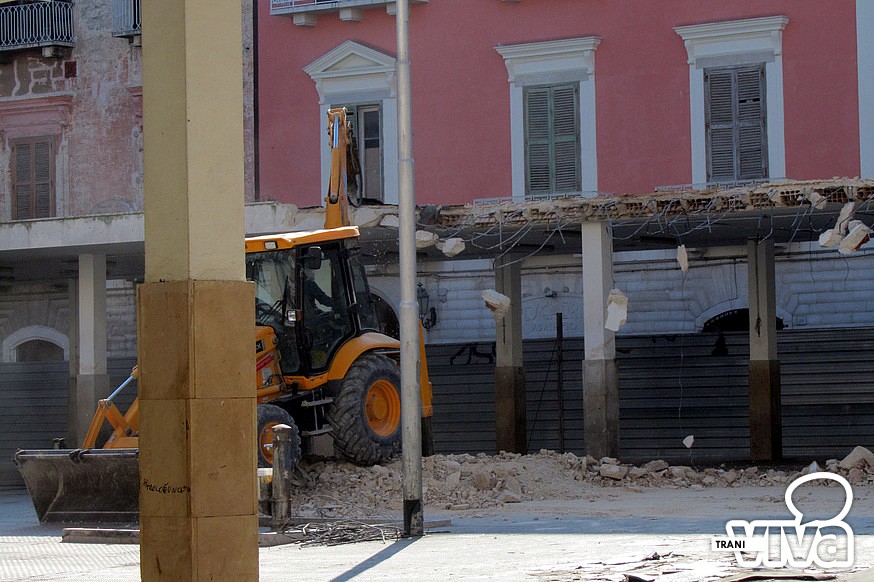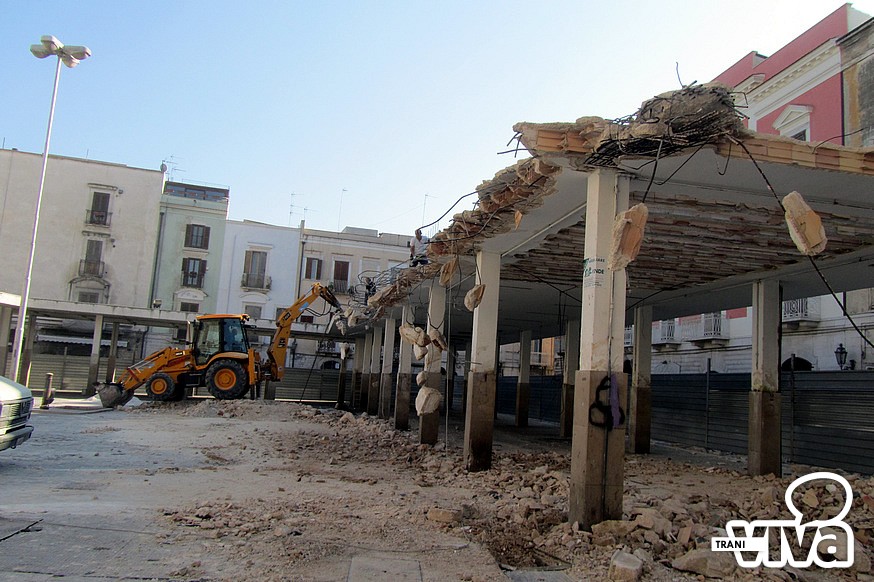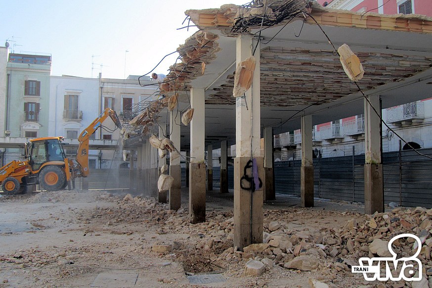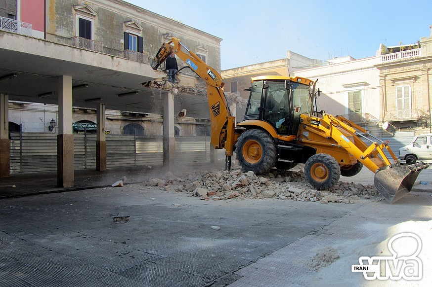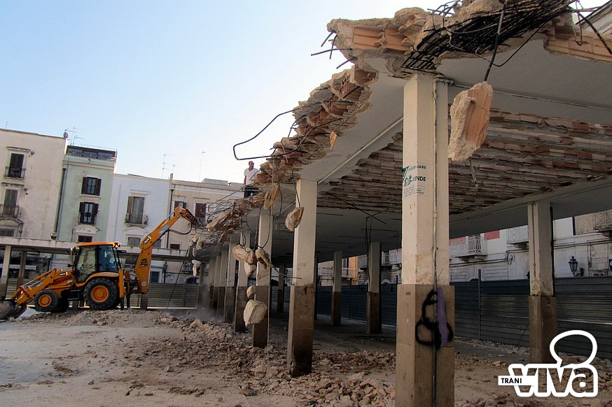 E' iniziata dal primo pomeriggio di oggi la demolizione della copertura dell'ormai ex mercato ittico di piazza Longobardi. Ruspe in azioni per abbattere la struttura, in cemento armato. «Successivamente – spiega l'assessore ai lavori pubblici, Piero Di Savino - sarà effettuato il rifacimento della pavimentazione in pietra di Trani con lastre picconate. Al centro della nuova piazza saranno posizionate le tavole degli Statuti Marittimi incise su pannellature in rame».