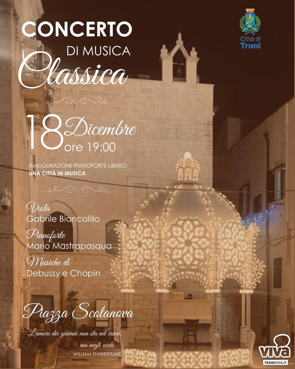 L' Amministrazione Comunale di Trani annuncia con entusiasmo il ritorno di uno degli appuntamenti più amati e significativi delle festività: l'installazione della Cassa Armonica con Pianoforte Libero in Piazza Scolanova.