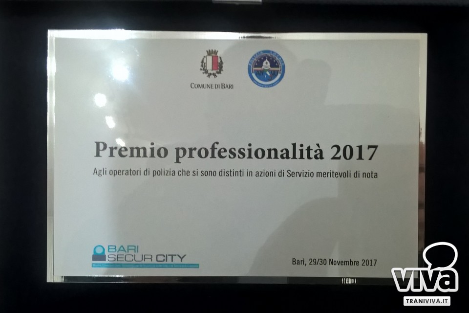 La predetta Manifestazione si è svolta in Bari nei giorni 29 e 30 novembre 2017 presso The Nicolaus Hotel. Durante tale Manifestazione, sono stati trattati e posti in evidenza temi di grande attualità e di grossa rilevanza, appartenenti a materie e compiti di Polizia, (Codice della strada, applicazione della Tecnologia al rilievo delle infrazioni stradali, Commercio, Sicurezza Urbana, Polizia Giudiziaria, Procedura Penale e Penale). Tali temi sono stati illustrati da Relatori di caratura Nazionale e Internazionale. Nella mattinata del 2° giorno 30 novembre 2017 , oltre ad affrontare i predetti argomenti, è stato riservato uno spazio per la premiazione ad Operatori di Polizia meritevoli di nota che si sono distinti per il loro servizio alla comunità, in operazioni di Polizia, durante il 2017, tra i quali sono state attribuite dall'Anvu (Associazione Professionale Polizia Locale d'Italia) e consegnate nello specifico dal Cav. Dott. Nicola Salvato Ufficiale della Polizia Locale di Venezia e Presidente Nazionale ANVU, numero 2 (due) targhe a titolo di premiazione e lodevole riconoscimento del servizio effettuato: "Premio Professionalità 2017 - Agli Operatori di Polizia che si sono distinti in azioni di Servizio Meritevoli di nota", all'Agente di Polizia Locale Montaruli Vito di Ruvo di Puglia(Bari) e al M.llo Ord. Fontana Calogero di Trani (BT), entrambi appartenenti al Comando Polizia Locale di Trani (BT) in servizio presso il "Settore Polizia Stradale: Pronto Intervento-Infortunistica Stradale-Polizia Giudiziaria", con la seguente motivazione: