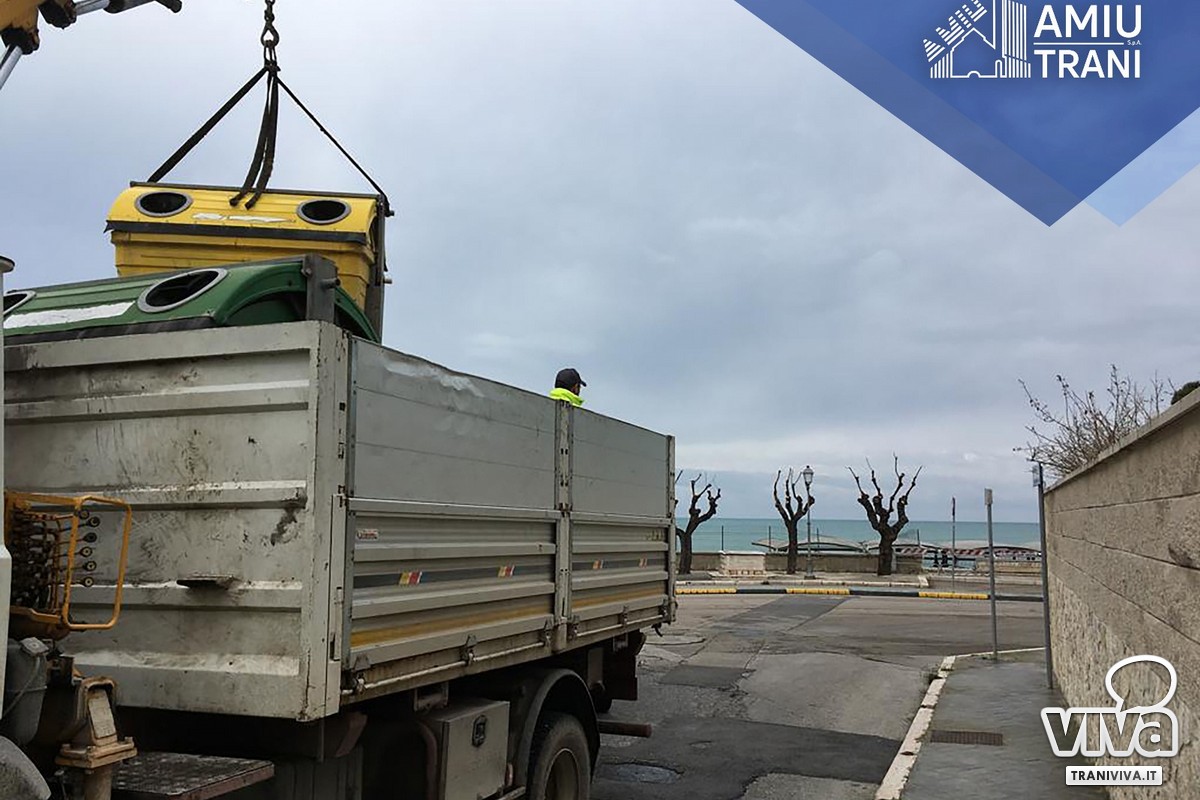 Amiu Trani comunica che su disposizione dell'amministrazione comunale ha eseguito la rimozione dei cassonetti stradali nei seguenti punti della città: viale de Gemmis (tratto da via Malcangi a Piazza Marinai d'Italia), Piazza Marinai d'Italia, Lungomare Mongelli, via Tevere (tratto da Lungomare C. Colombo a Piazza Santa Maria di Colonna), Piazza Santa Maria di Colonna, Lungomare Cristoforo Colombo, via Statuti Marittimi.