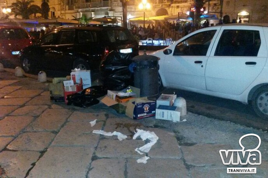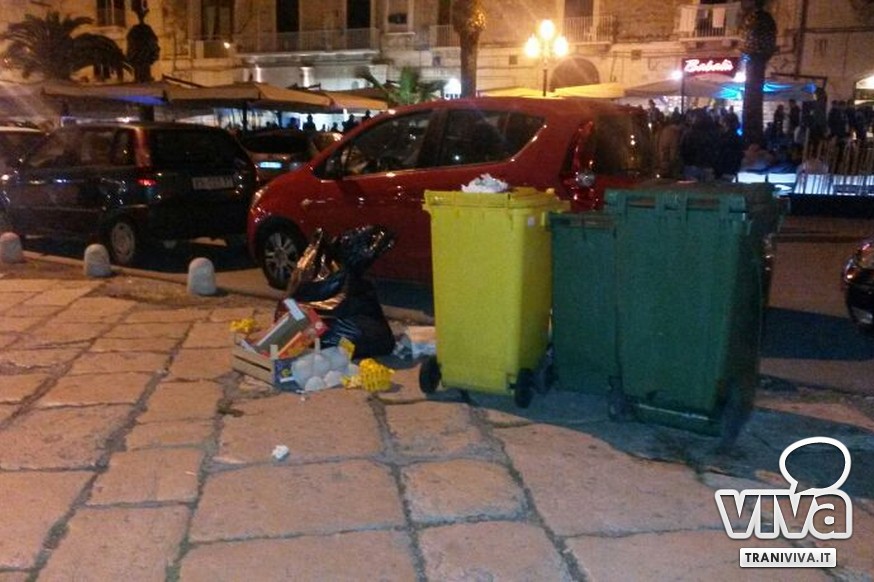 A pochi passi dai locali al centro della movida tranese vengono a formarsi, a tutti gli effetti, piccole discariche a cielo aperto. Stessa situazione è stata registrata poco dopo in via Mario Pagano. Qui l'unico bidoncino presente era stracolmo di rifiuti, piatti di plastica e tovaglioli, abbandonati a terra, generando anche polemiche e lamentele tra i passanti. Visto l'avvicinamento della stagione estiva, come ogni anno, il porto sarà luogo di ritrovo di molti giovani e simbolo della vita notturna della zona, non è pensabile che l'area portuale debba presentarsi in questo modo. È necessario, da parte di amministrazione comunale e Amiu, riattivare, come accaduto già negli anni passati, la raccolta di rifiuti anche durante l'orario notturno da parte degli operatori ecologici, così da evitare questo triste spettacolo.