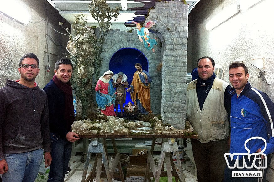 L'opera, che ha richiesto tre settimane di lavoro con la collaborazione della falegnameria del tranese Biagio Tempesta, rappresenta la scena della natività tra antichi ruderi che richiamano le architetture e la pietra della nostre splendide masserie, con l'aggiunta di elementi decorativi e naturali quali la roccia chiara, che rievoca la nostra famosa e caratteristica pietra tranese.