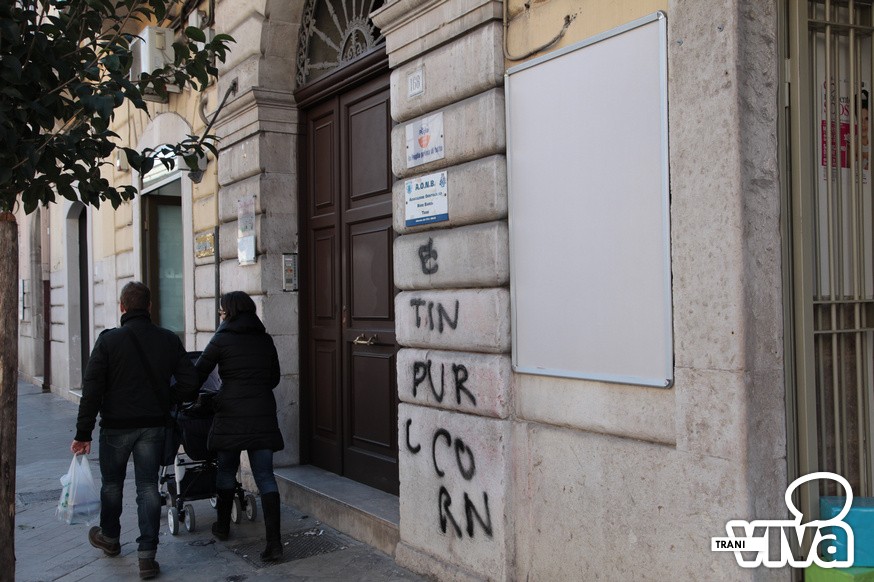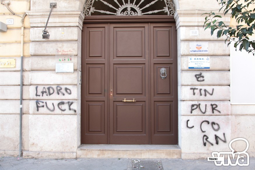 Preso di mira nuovamente il muro adiacente il portone d'ingresso della sede del partito di Riserbato (La Puglia prima di tutto) in corso Vittorio Emanuele. Il candidato sindaco non ha voluto rilasciare dichiarazioni sulla vicenda. «Si commenta da sola e non voglio darci peso».