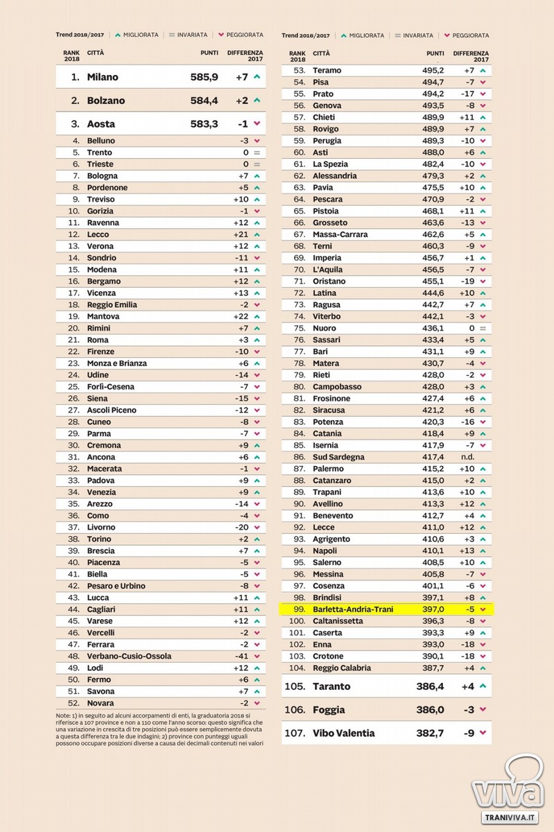 La Provincia di Barletta-Andria-Trani, con Taranto e Foggia, è tra le ultime 10 in classifica. È una delle province, dunque, dove si vive peggio. In controtendenza - nella performance rispetto all'anno scorso - solo Lecce, che sale di 12 posizioni (al 92esimo posto), e Bari che guadagna nove posizioni.