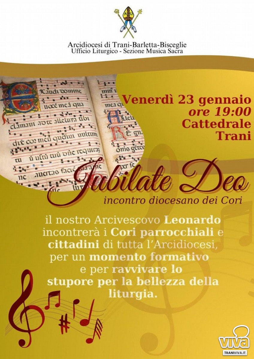 È partendo da questa consapevolezza – che vede nel canto uno strumento privilegiato di evangelizzazione e lode – che l'Arcidiocesi di Trani-Barletta-Bisceglie si prepara a vivere un momento di intensa comunione spirituale. Venerdì 23 gennaio, alle ore 19.00, la Cattedrale di Trani aprirà le sue porte per "Iubilate Deo", l'incontro diocesano dei cori promosso dall'Ufficio Liturgico – Sezione Musica Sacra.