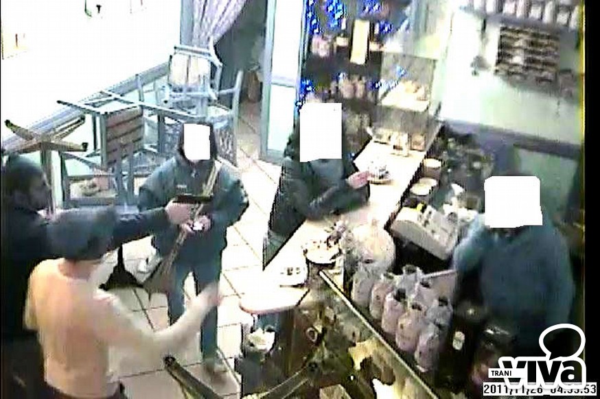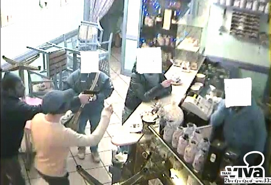 Intorno alle 4 di sabato, al 113 era giunta la telefonata di una signora intenta ad inseguire, a bordo della propria auto, in corso Italia, una Ford Ka con a bordo dei giovani che avevano poco prima rapinato l'incasso di un bar situato nella zona sud di Trani. Dopo qualche minuto, la pattuglia della squadra volante della Polizia intercettava in via Malcangi (angolo con via De Gemmis), l'autovettura in questione con a bordo un giovane (L. M.). Dopo la perquisizione, il ragazzo veniva accompagnato in commissariato. Successivamente giungeva la proprietaria del bar che riferiva agli agenti quanto accaduto, ossia di essere stata rapinata, intorno alle 3.30 (poco prima della chiusura dell'attività) da due individui di sesso maschile entrambi con il viso coperto da calzamaglia. Il bottino era stato magro: 45 euro. La proprietaria del bar aggiungeva anche che, circa tre quarti d'ora prima della rapina, i due ragazzi erano già entrati all'interno del suo locale, unitamente ad altri due giovani. Grazie al sistema di videosorveglianza interno del bar, venivano visionati i filmati ed estrapolate le immagini, che consentivano agli operatori di Polizia di riconoscere senza ombra di dubbio i due pregiudicati che avevano commesso la rapina.