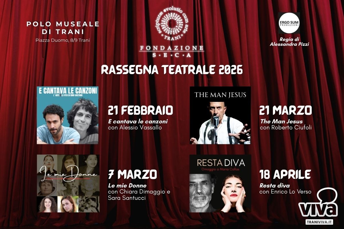 Nel suggestivo scenario del Polo Museale di Trani prende forma la Rassegna Teatrale 2026, un percorso artistico articolato in quattro appuntamenti che portano in scena linguaggi, visioni e poetiche del teatro contemporaneo, ideata da Fondazione S.E.C.A., aprendo la stagione artistica Fuori Museo 2026. Gli spettacoli, prodotti da Ergo Sum Produzioni, compongono un itinerario che attraversa narrazione, corpo, parola e immaginazione, offrendo al pubblico esperienze teatrali diverse ma unite da una forte ricerca espressiva e da un dialogo costante con lo spettatore.
