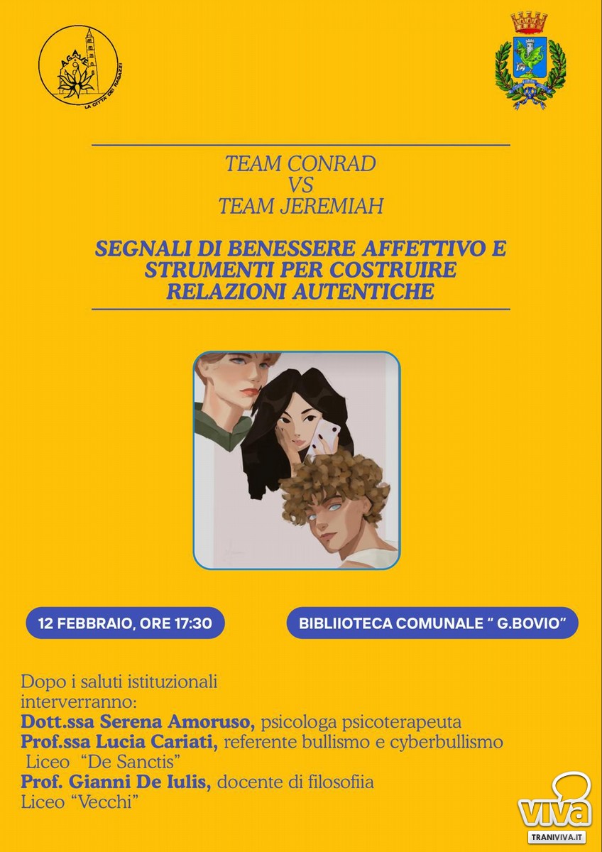 Giovedì 12 febbraio 2026, ore 17.30 è organizzato, in Biblioteca Comunale "G.Bovio", un incontro tematico che sarà un confronto attuale e stimolante sul tema delle relazioni affettive sane, ispirato all'immaginario narrativo di TEAM CONRAD VS TEAM JEREMIAH. SEGNALI DI BENESSERE AFFETTIVO E STRUMENTI PER COSTRUIRE RELAZIONI AUTENTICHE, diventa occasione di riflessione e dialogo su emozioni, consapevolezza e benessere relazionale.