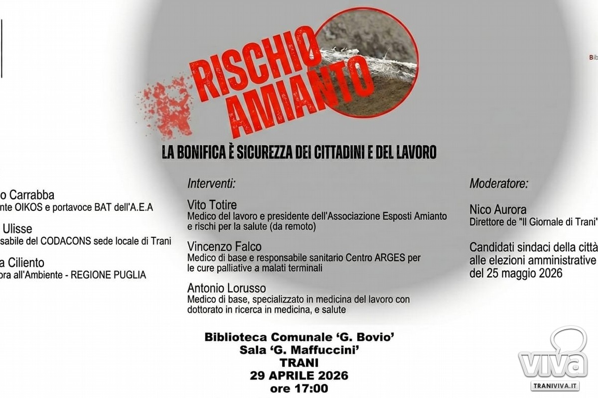 Un fronte comune: medici e associazioni - Il parterre dei relatori sottolinea la multidimensionalità del problema. Se l'avvocato Nicola Ulisse (Codacons) pone l'accento sulle tutele legali e le responsabilità dei proprietari e degli enti, il fronte medico – rappresentato da Vito Totire (sarà collegato da remoto), Vincenzo Falco e Antonio Lorusso – evidenzia come la prevenzione primaria sia l'unica vera cura. Il mesotelioma ha tempi di latenza lunghissimi, ma la sua insorgenza dipende direttamente dalla quantità di fibre inalate oggi. Presente anche la Regione Puglia con l'assessora all'ambiente Debora Ciliento, chiamata a rispondere sulle strategie del Piano Regionale Amianto e sui fondi destinati ai Comuni per mappare e bonificare i siti contaminati.