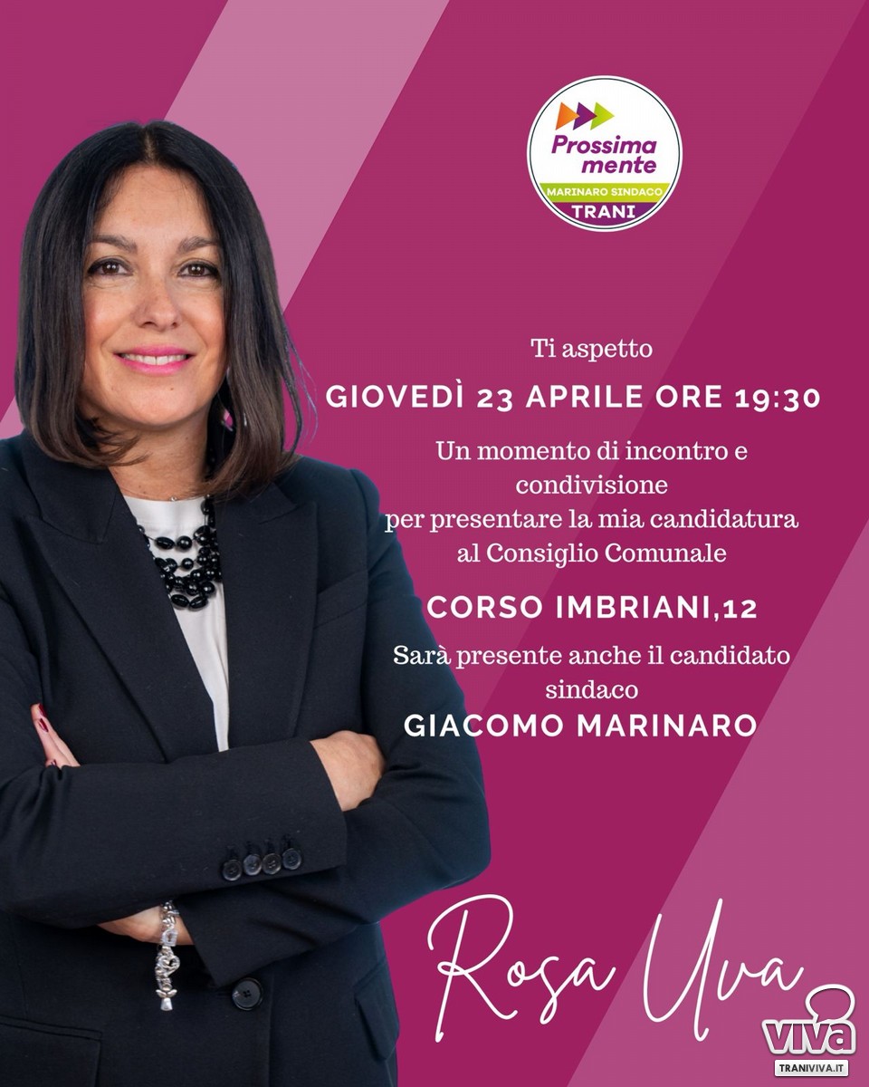 Giovedì 23 aprile, alle ore 19:30, presso la sede del comitato elettorale in Corso Imbriani, 12, Rosa Uva presenterà ufficialmente alla cittadinanza la propria candidatura al Consiglio Comunale per le elezioni del 24 e 25 maggio 2026. L'esperienza amministrativa messa al servizio di un progetto concreto e coraggioso. Inserita nella lista "Prossimamente", Rosa Uva correrà a sostegno del candidato Sindaco Giacomo Marinaro, il quale parteciperà attivamente all'incontro per illustrare la visione comune per il futuro della città.