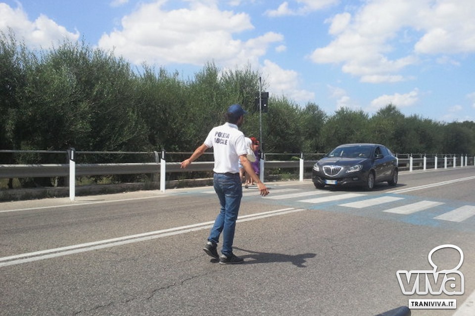 Sul posto due agenti della Polizia Locale sorvegliano l'attraversamento pedonale