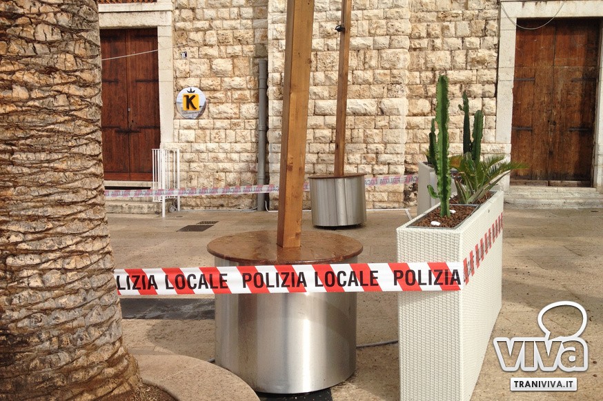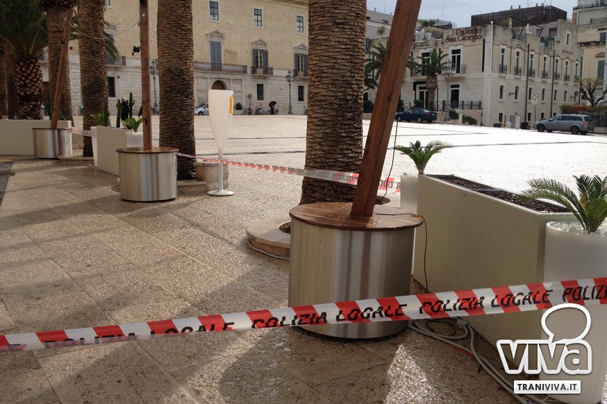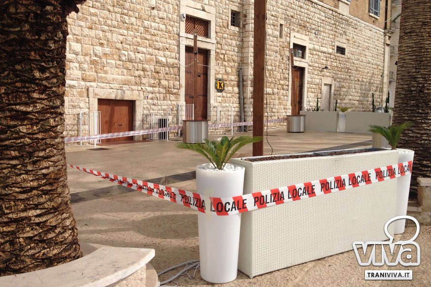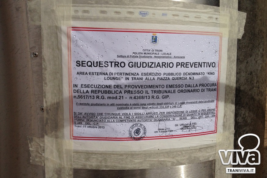 La Polizia Locale di Trani, in esecuzione di un provvedimento emesso dalla locale Procura della Repubblica, ha eseguito nella giornata di ieri il sequestro giudiziario preventivo dell'area esterna del locale pubblico "King Lounge". Si tratta di un bar avviato da pochi mesi che utilizza parte di Piazza Quercia come veranda all'aperto con tavolini, sedie, fioriere e ombrelloni. I sigilli apposti dagli agenti nelle scorse ore intorno a fioriere ed arredi vietano l'utilizzo dell'area sottoposta a sequestro.