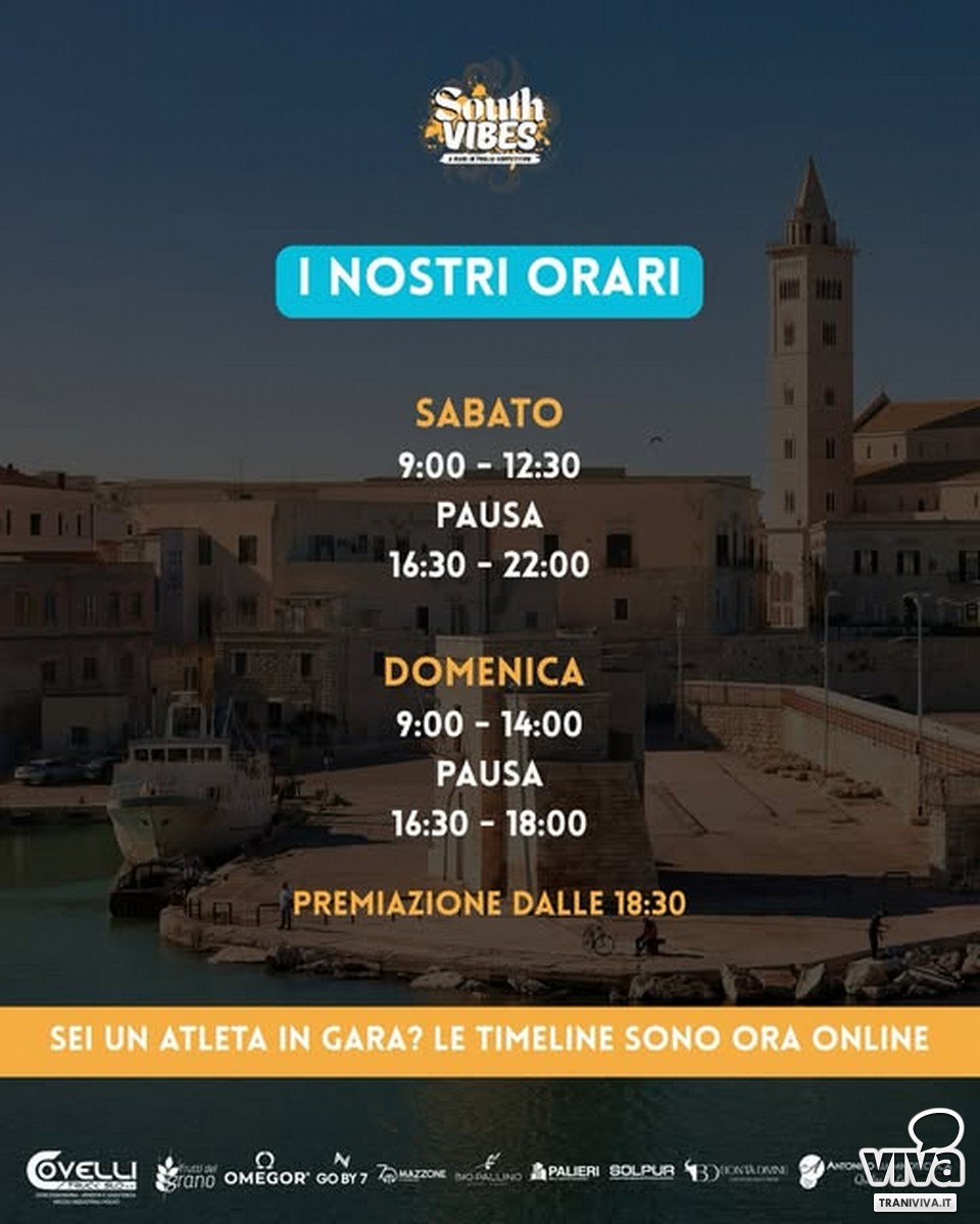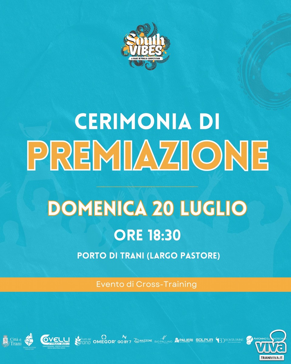 L'iniziativa ha ricevuto il sostegno economico del Comune di Trani, un segnale forte dell'impegno dell'amministrazione nella promozione di eventi sportivi e culturali di alto livello: "Questa collaborazione è cruciale e si spera possa consolidare questa sinergia"per future edizioni, - come sottolineato dall'organizzazione - magari ampliando il format e coinvolgendo ancora più realtà locali. South Vibes si propone di essere un appuntamento fisso per l'estate pugliese, un'occasione imperdibile per vivere il meglio del territorio in riva al mare e mostrare come il Cross-Training possa essere "un percorso che promuove la salute, la forza e la resilienza mentale". L'appuntamento è fissato per domani, domenica 20 luglio, al Porto di Trani (Largo Pastore), dalle 9:00 a mezzanotte, per concludere in grande stile questa prima, promettente edizione.