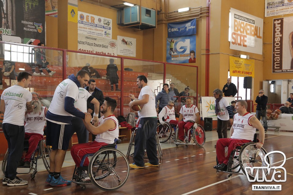 Sul parquèt del PalaAssi di Trani si sono "sfidate" le squadre di basket in carrozzina Sport Insieme Sud Barletta e i top player di alcune squadre di basket tranesi (Juve Trani, Avis Basket Trani, Cavaliers Basket). Per gli atleti normodotati condividere il campo di gioco con una persona con disabilità è stata senza dubbio un'esperienza illuminante e sorprendente.