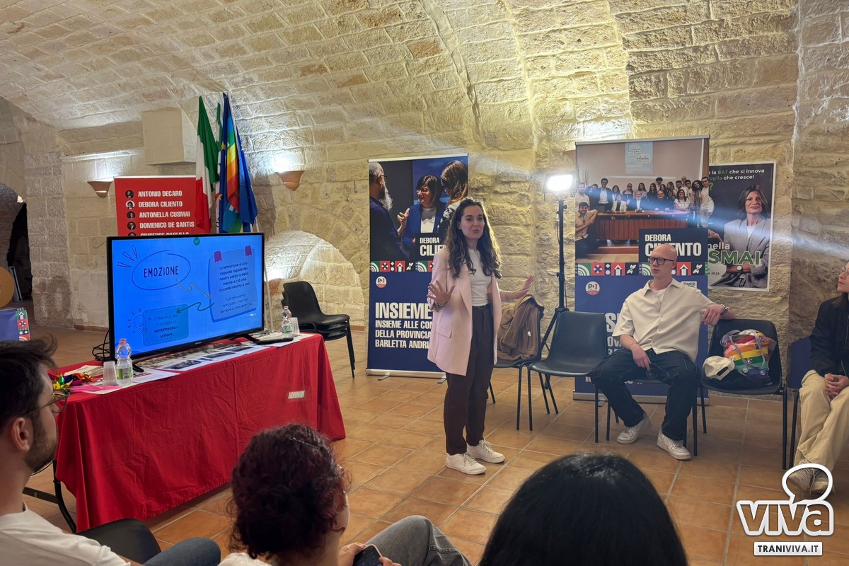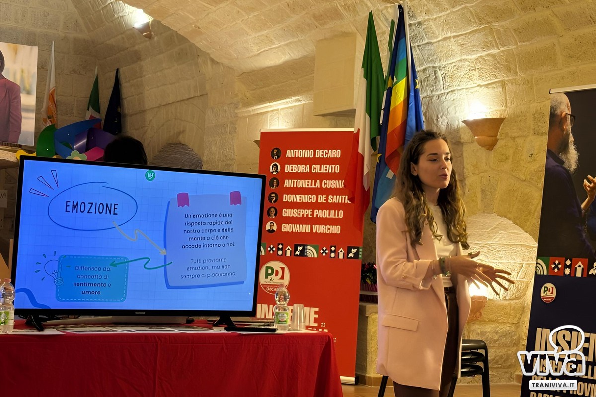 Il 24 ottobre, in via Mario Pagano, si è svolto l'incontro dal titolo "STAI SERENA! – Consapevolezza emotiva", organizzato dai Giovani Democratici di Trani. L'evento è stato un confronto promosso dai Giovani Democratici di Trani, per riflettere sul valore della consapevolezza emotiva e del benessere psicologico nella comunità. ha rappresentato un importante momento di riflessione e confronto sul tema della consapevolezza emotiva e del benessere psicologico, coinvolgendo figure istituzionali e professionisti del settore.