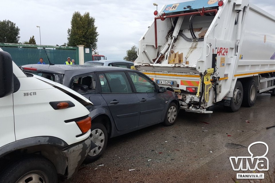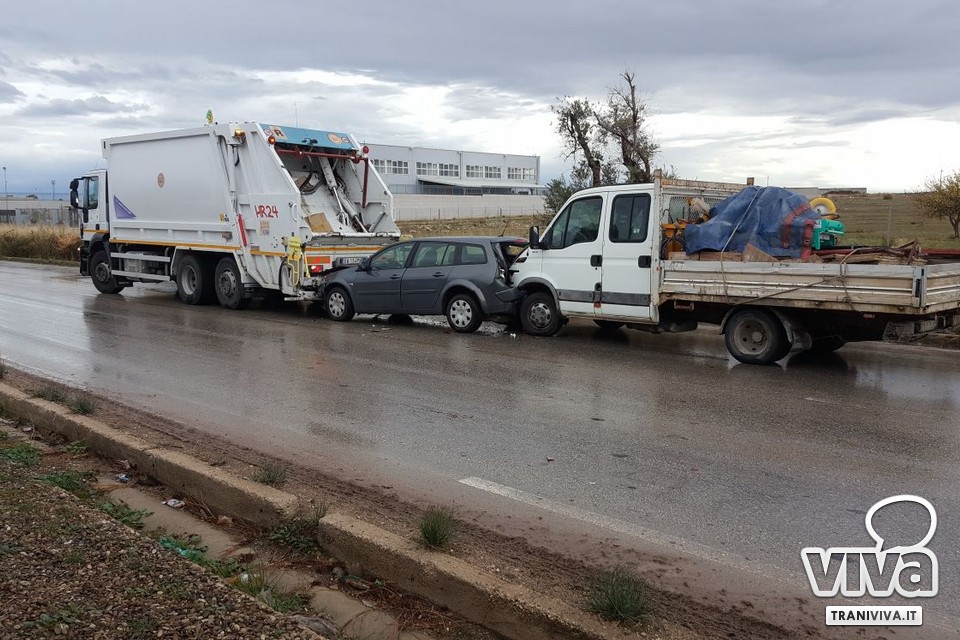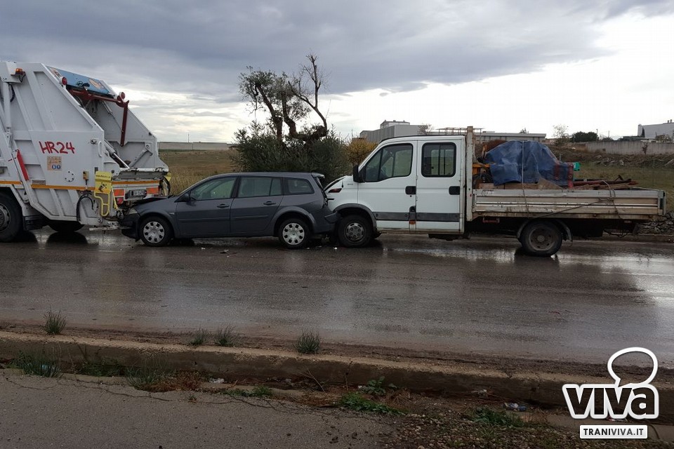 Un tamponamento a catena si è verificato questa mattina, poco dopo le ore 10, sulla strada provinciale Andria-Trani, all'altezza della curva della Siesca Asfalti che precede il ponte autostradale in direzione Trani. Tre i mezzi coinvolti, un autocompattatore per la raccolta dei rifiuti della ditta "Sangalli", una VW Golf Ws ed un furgone.