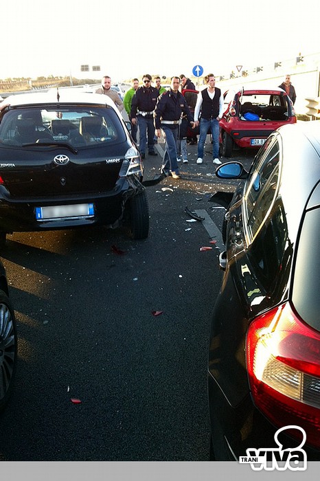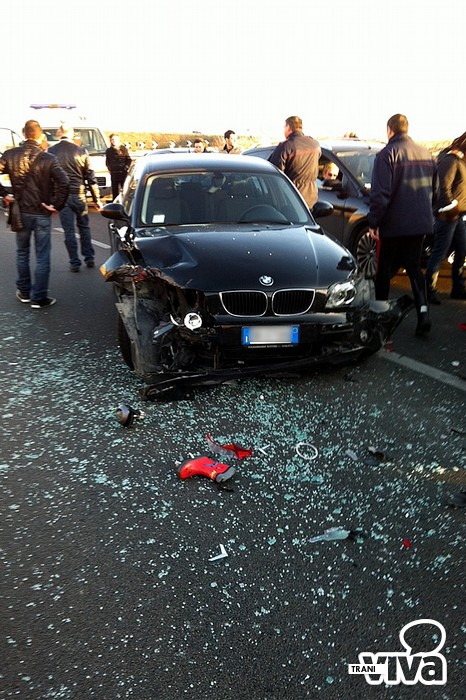 Per cause ancora da chiarire, una Bmw ha tamponato due auto. Complessivamente, a bordo delle macchine incidentate c'erano otto persone, ma solo sei hanno necessitato delle cure dei soccorritori. Fra queste, una donna di 25 anni al quinto mese di gravidanza trasportata al Bonomo di Andria per un trauma in zona lombare.
