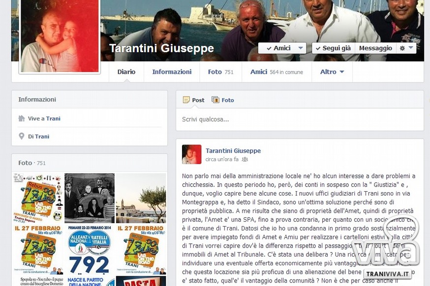 La polemica, come anticipato, non è diretta alle parole del sindaco Riserbato ed ecco che questo emerge dal post di Tarantini: «Datosi che io ho una condanna in primo grado – si legge ancora - sostanzialmente per avere impiegato fondi di Amet e Amiu per realizzare i cartelloni estivi della città di Trani vorrei capire dov'è la differenza rispetto al passaggio "tour court" degli immobili di Amet al Tribunale. C'è stata una delibera? Una ricerca di mercato per individuare una eventuale offerta economicamente più vantaggiosa? Si è verificato che questa locazione sia più proficua di una alienazione del bene? E se tutto questo è stato fatto, qual è il vantaggio della comunità? Non è che per caso anche il povero Sindaco attuale trova un PM che sostiene che ha fatto tutto questo per il proprio tornaconto elettorale? A meno che non si pensi che, quando c'è di mezzo il Tribunale, tutto sia lecito e tutto si possa fare...». La discussione è aperta.