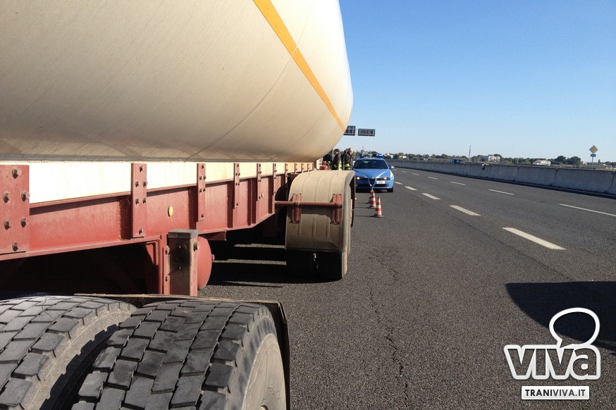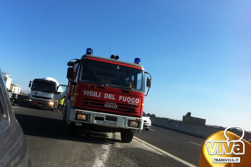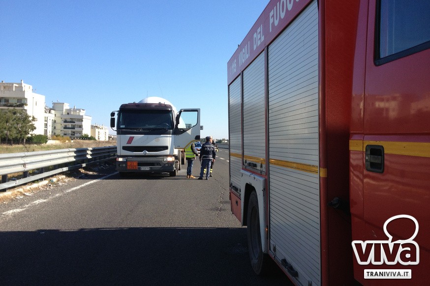 Un autoarticolato contenente gas è rimasto in panne sulla statale 16 bis, nei pressi dello svincolo di Trani Sant'Angelo, in direzione nord. Durante la marcia il conducente si è accorto di un problema all'impianto frenante che è rimasto bloccato su uno degli assi centrali: a causa del forte attrito si è sviluppato del fumo in prossimità di una delle coppie di pneumatici interessate dal guasto. Un'esplosione avrebbe potuto avere conseguenze devastanti.