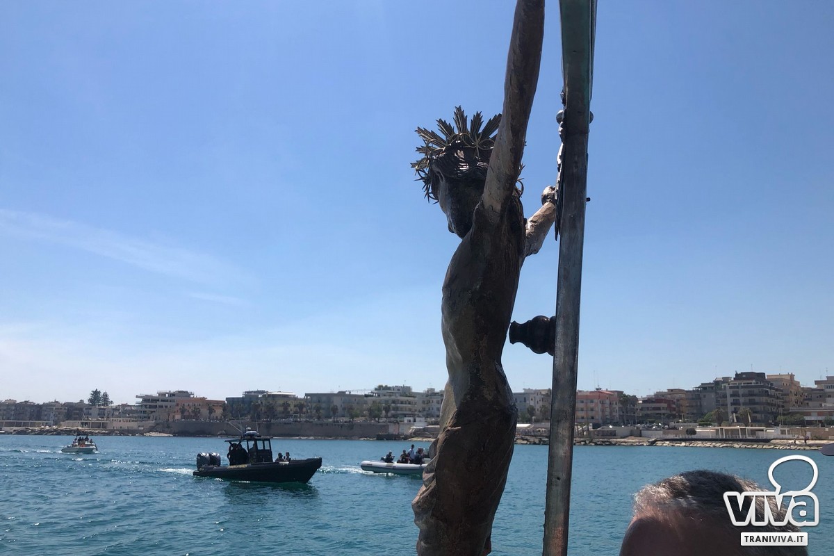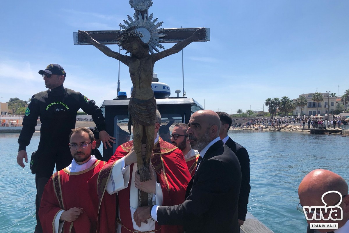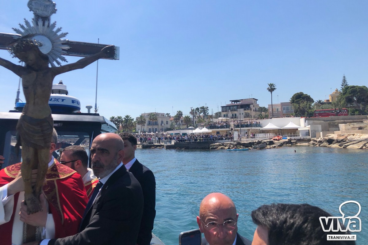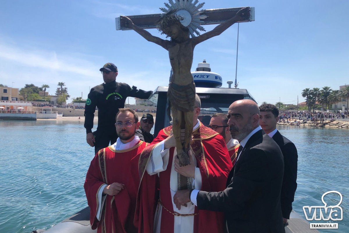 Il Sacro Crocifisso, come da programma, è stato trasportato via terra fino al Lido Anmi e da lì imbarcato sulla motovedetta della Guardia di Finanza. Dopo un breve tragitto via mare, lo sbarco è avvenuto al Molo Santa Lucia, dove il simulacro è stato accolto da un caloroso benvenuto fatto di musica, fuochi pirotecnici e l'abbraccio gioioso dei presenti.
