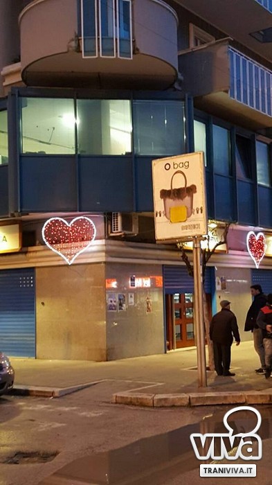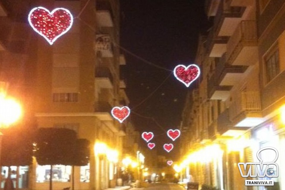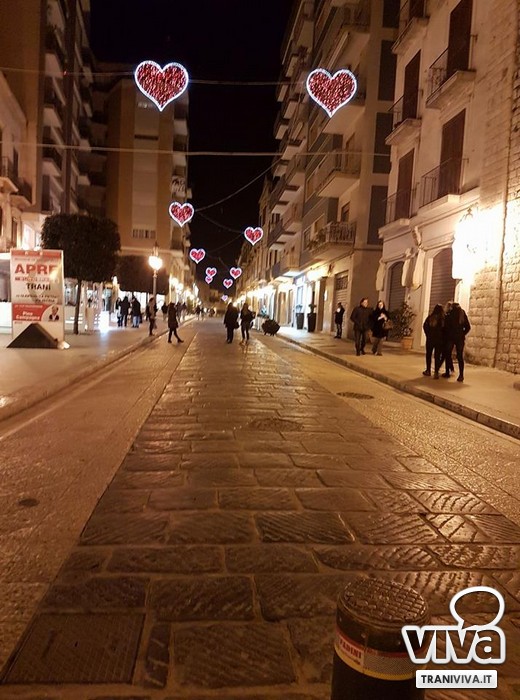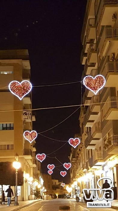 È la trovata della ditta guidata da Mario Minerva di Trani che quest'anno ha deciso di colorare le vie della città con le sue luminarie anche nell'occasione di San Valentino, festa degli innamorati. Una trovata "diversa" e probabilmente mai presentata a Trani ma che ha sicuramente attirato l'attenzione di tanti che hanno iniziato a condividere le fotografie sui social network.