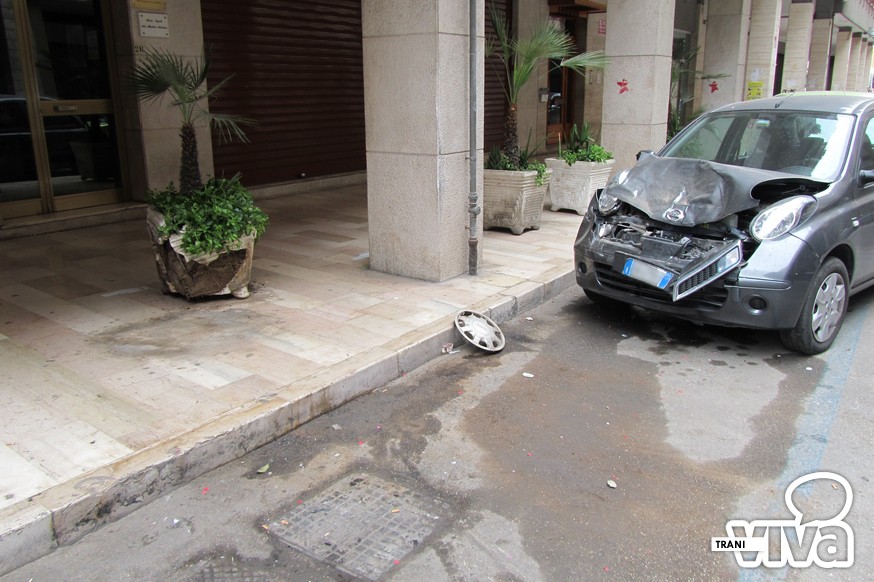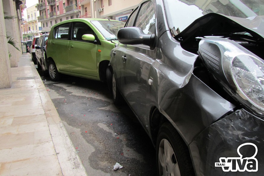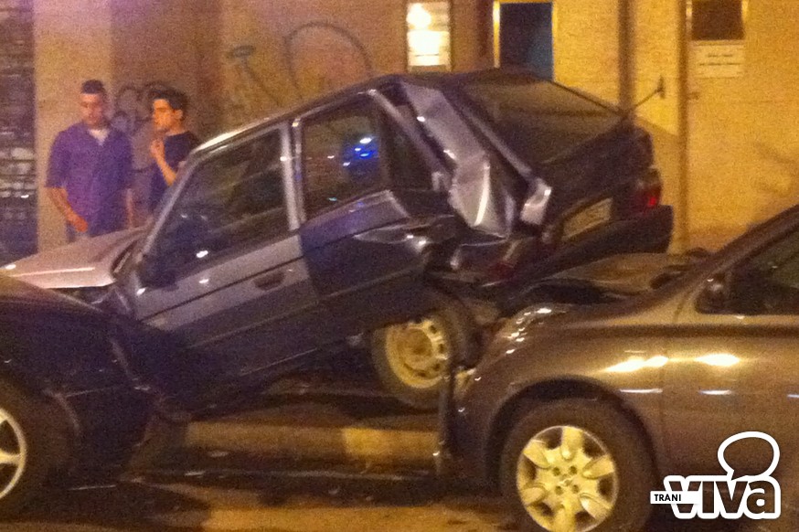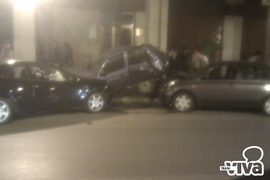 A Trani un altro sabato notte viene caratterizzato da un incidente stradale, per fortuna senza vittime. Intorno alle 2, un boato ha svegliato i residenti di corso Italia. Un automobilista al volante di una Mercedes Clk, proveniente da corso Italia e diretto verso corso Vittorio Emanuele, per cause ancora da accertare, ha perso il controllo della vettura e si è schientato a forte velocità contro le auto in sosta all'altezza del civico 28.