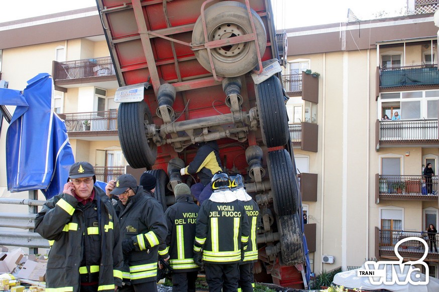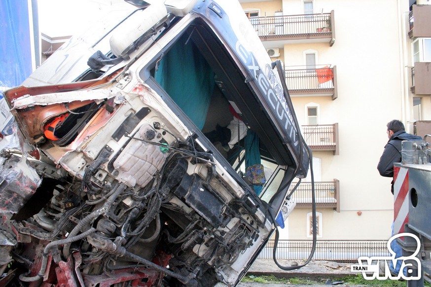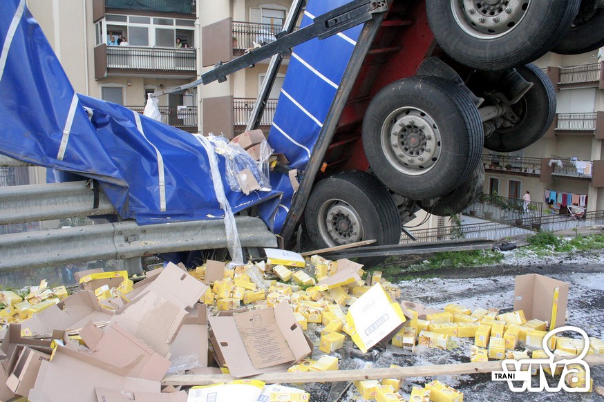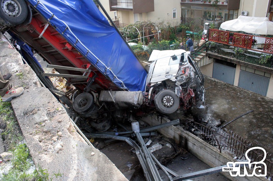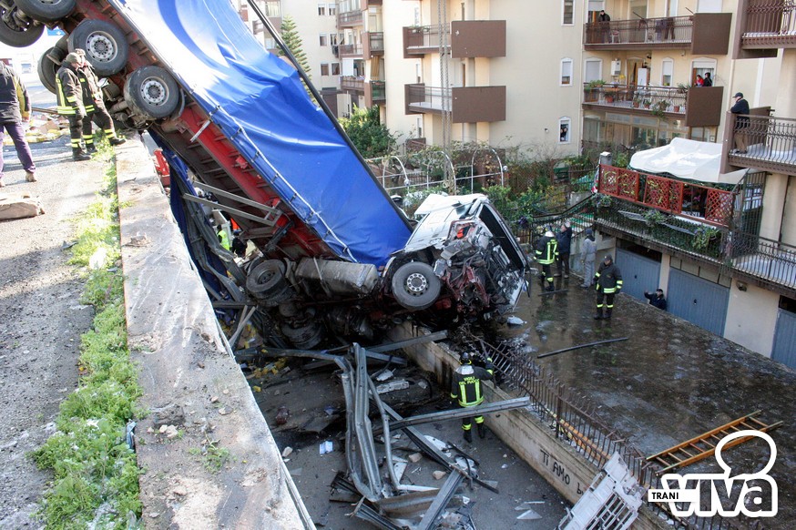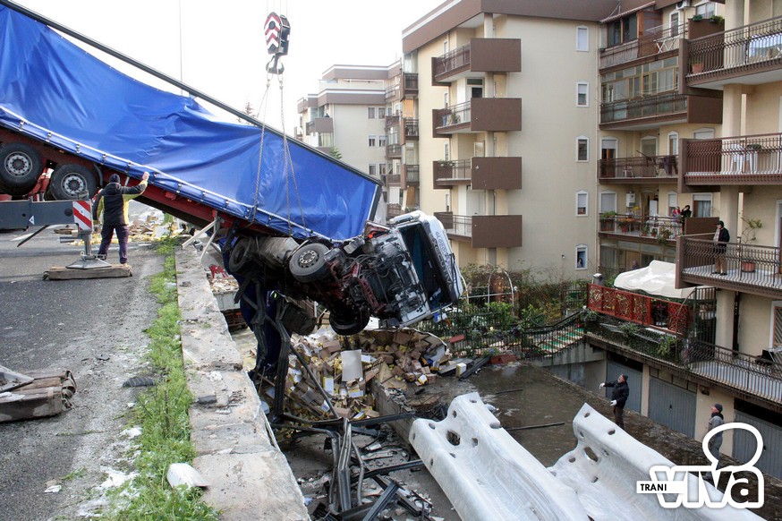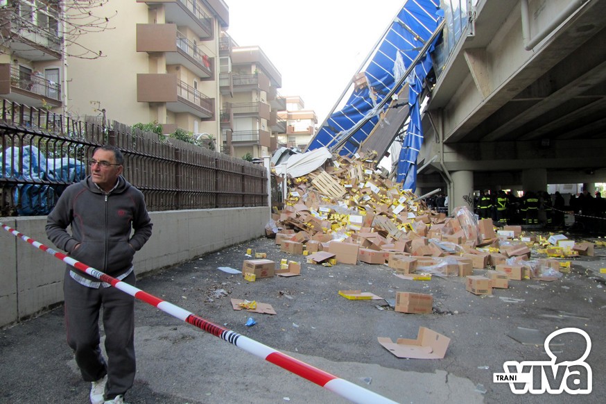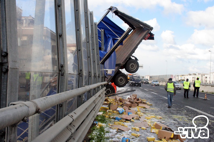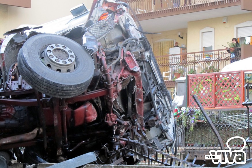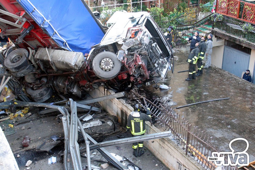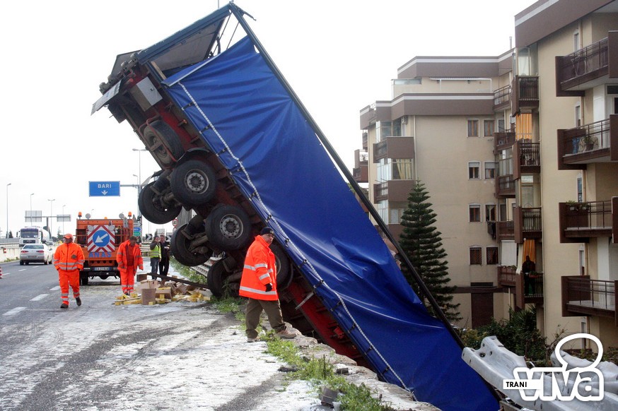 Un camion blu, contenente pasta, probabilmente a causa del manto stradale ghiacciato, ha sfondato il guard rail e le barriere anti rumore della statale 16 bis ed è rimasto in bilico per ore a strapiombo sulle abitazioni di via Cilea che si affacciano su via Superga. L'episodio si è verificato all'altezza di Trani centro, in direzione Bari.