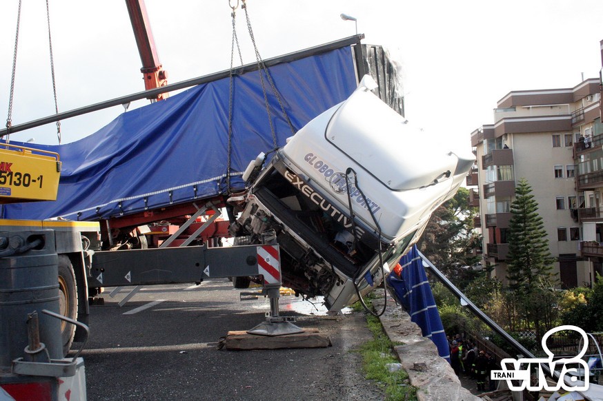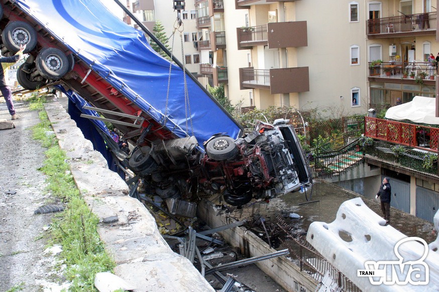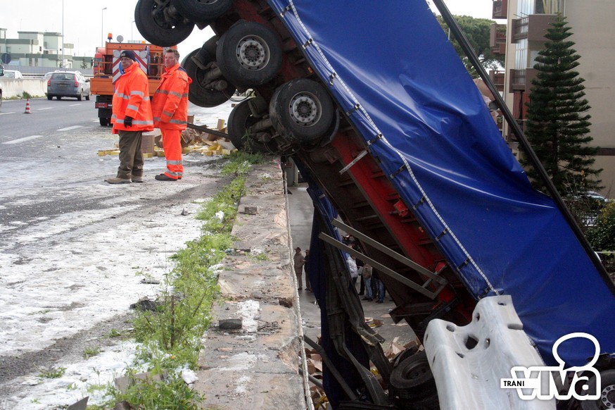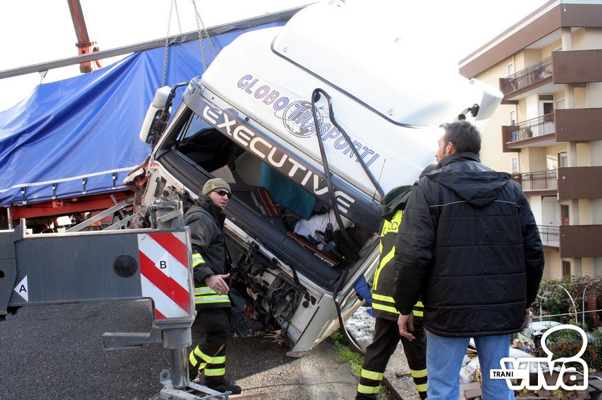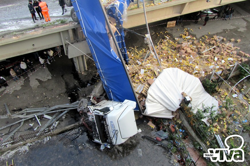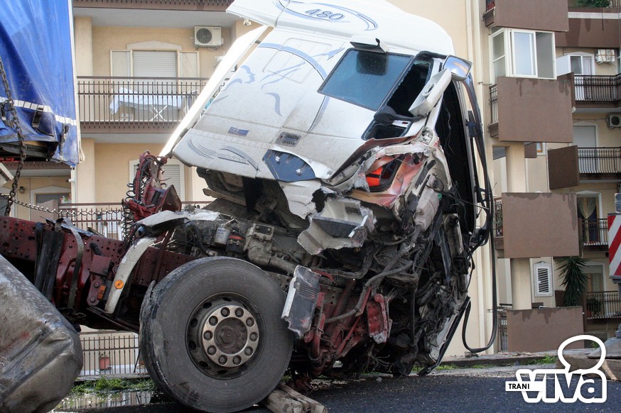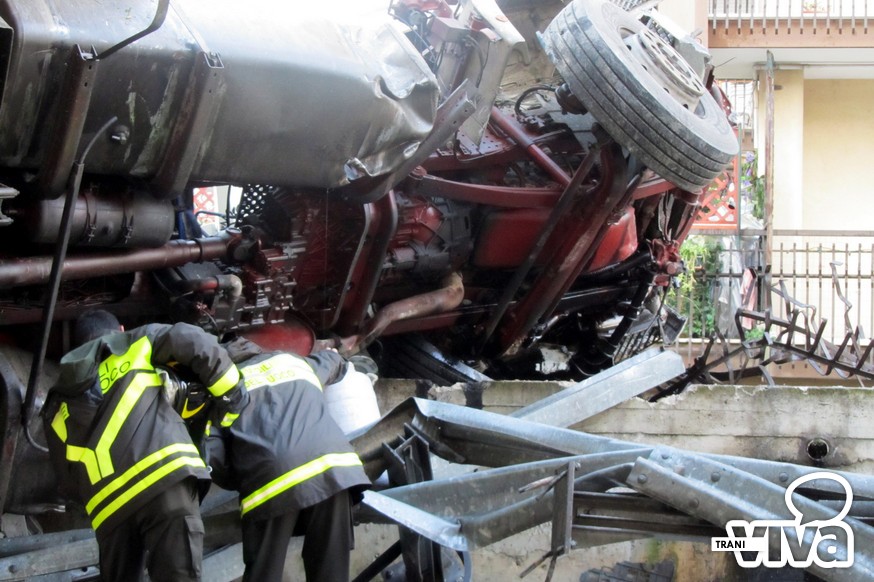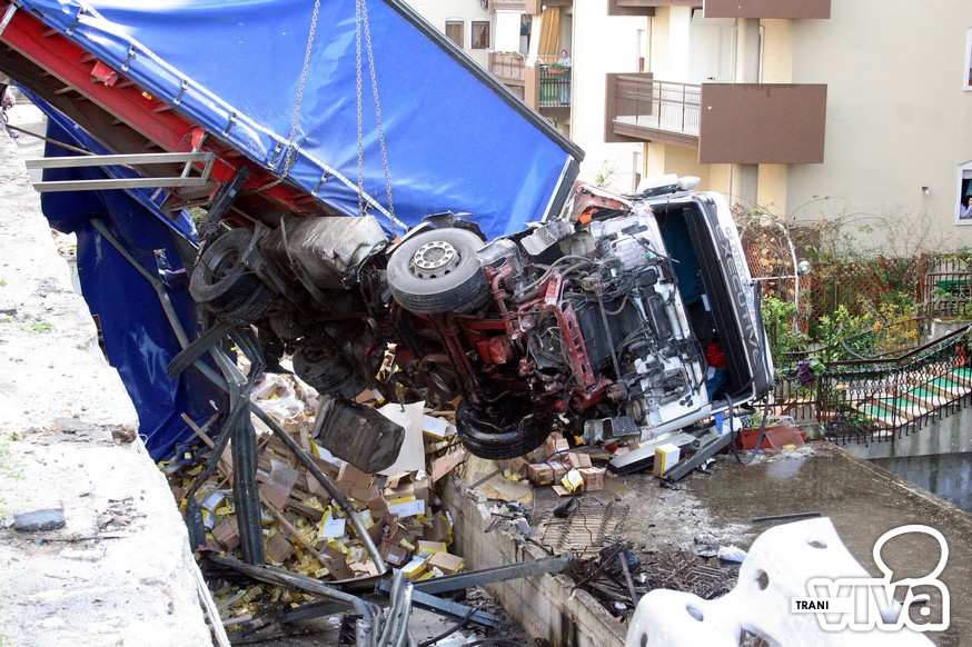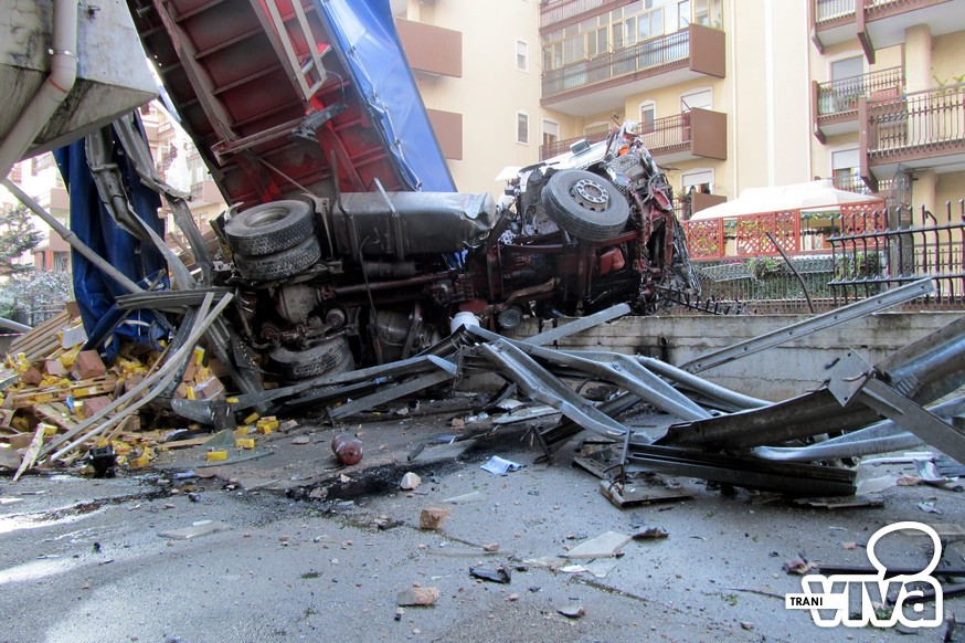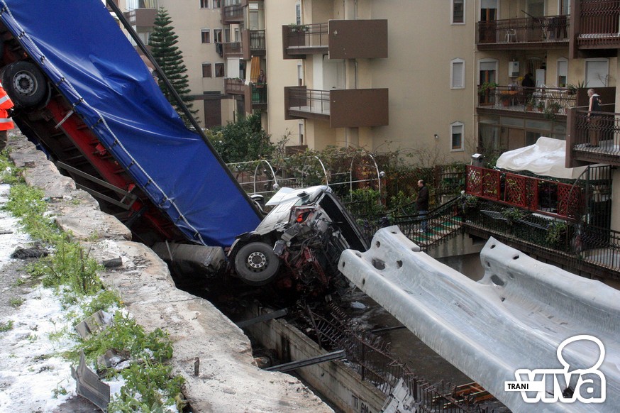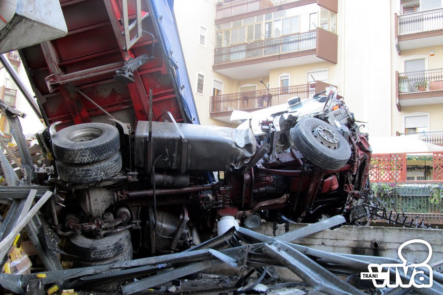 Un camion blu, contenente pasta, probabilmente a causa del manto stradale ghiacciato, ha sfondato il guard rail e le barriere anti rumore della statale 16 bis ed è rimasto in bilico per ore a strapiombo sulle abitazioni di via Cilea che si affacciano su via Superga. L'episodio si è verificato all'altezza di Trani centro, in direzione Bari.