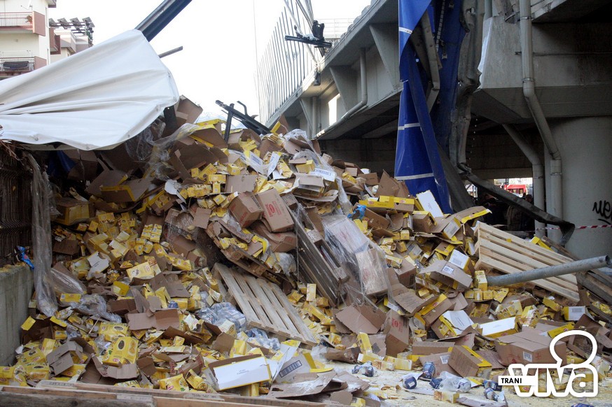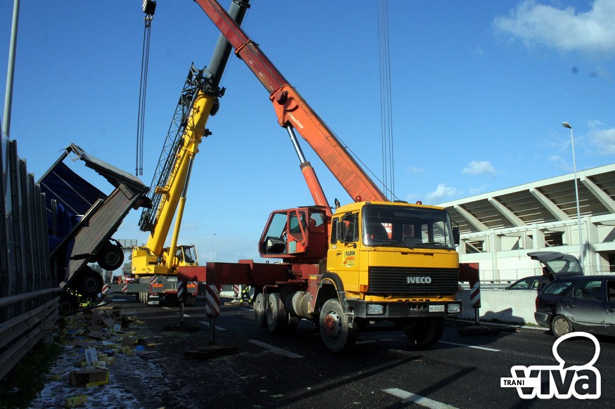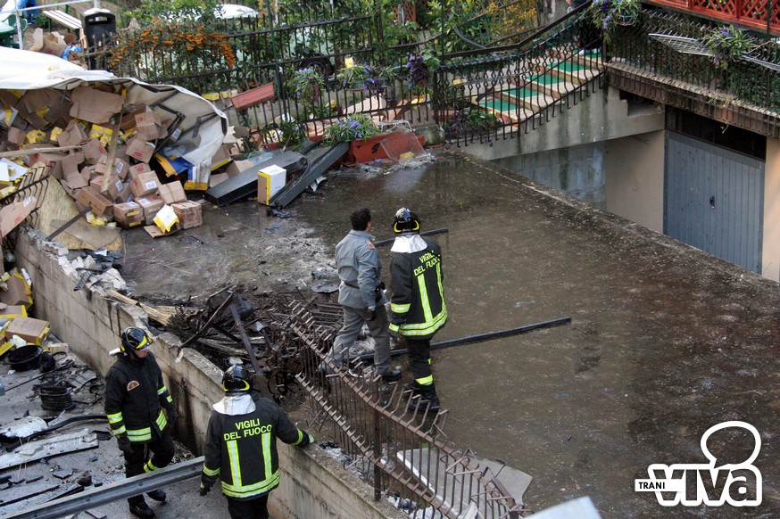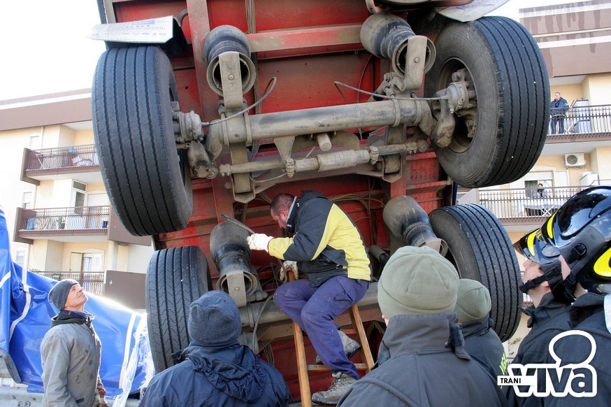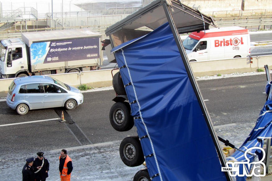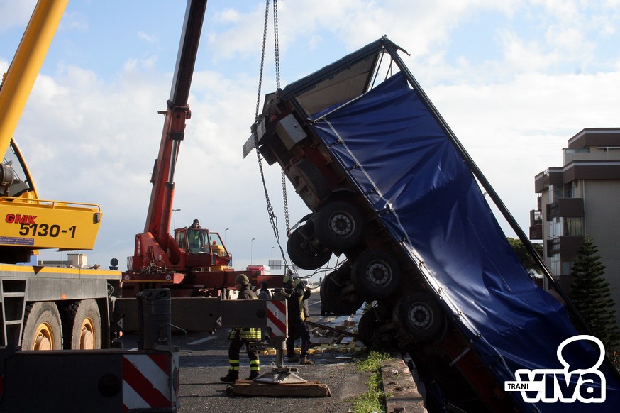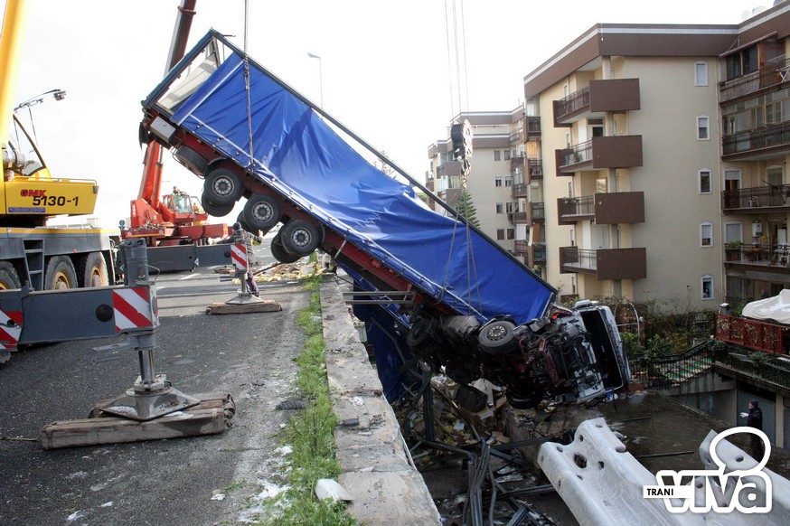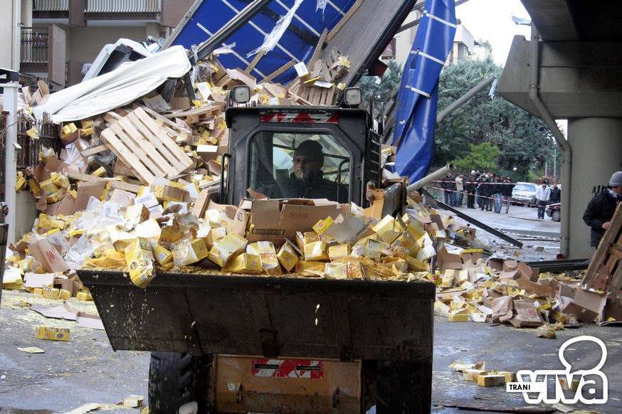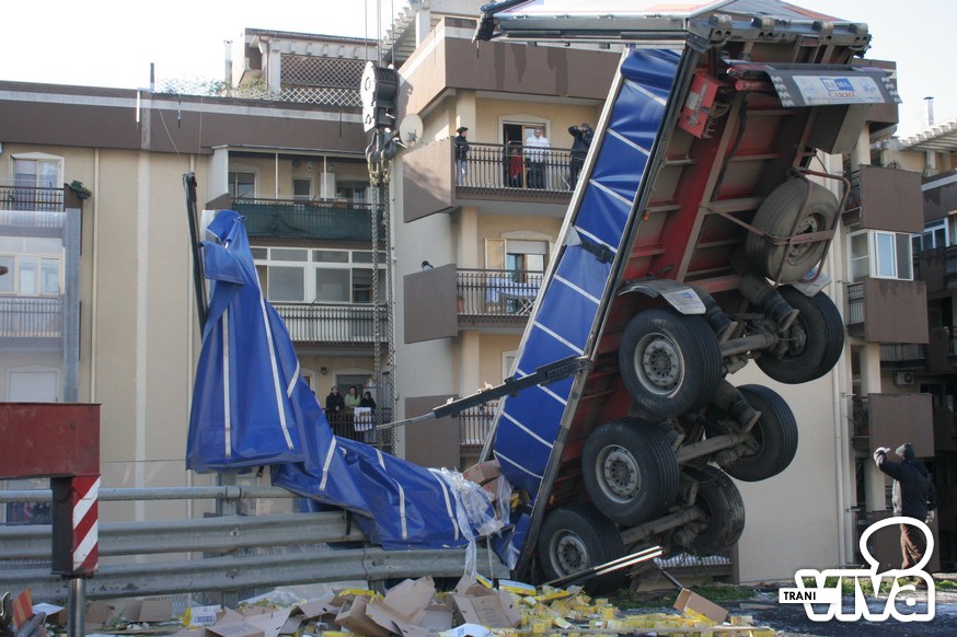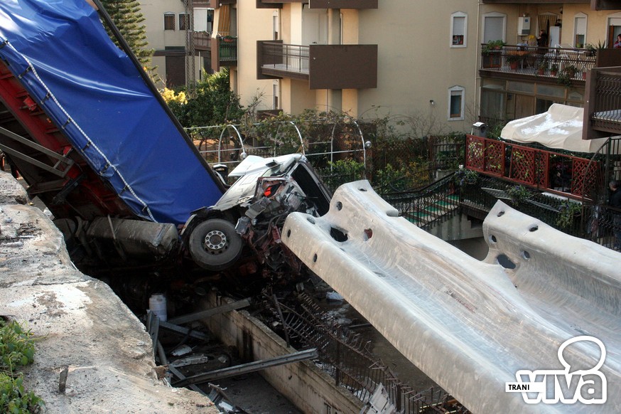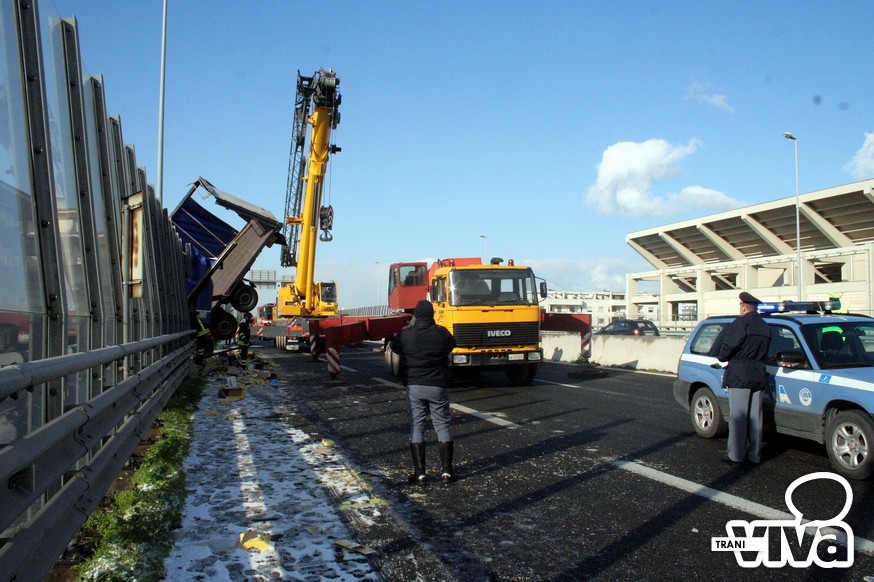 Un camion blu, contenente pasta, probabilmente a causa del manto stradale ghiacciato, ha sfondato il guard rail e le barriere anti rumore della statale 16 bis ed è rimasto in bilico per ore a strapiombo sulle abitazioni di via Cilea che si affacciano su via Superga. L'episodio si è verificato all'altezza di Trani centro, in direzione Bari.